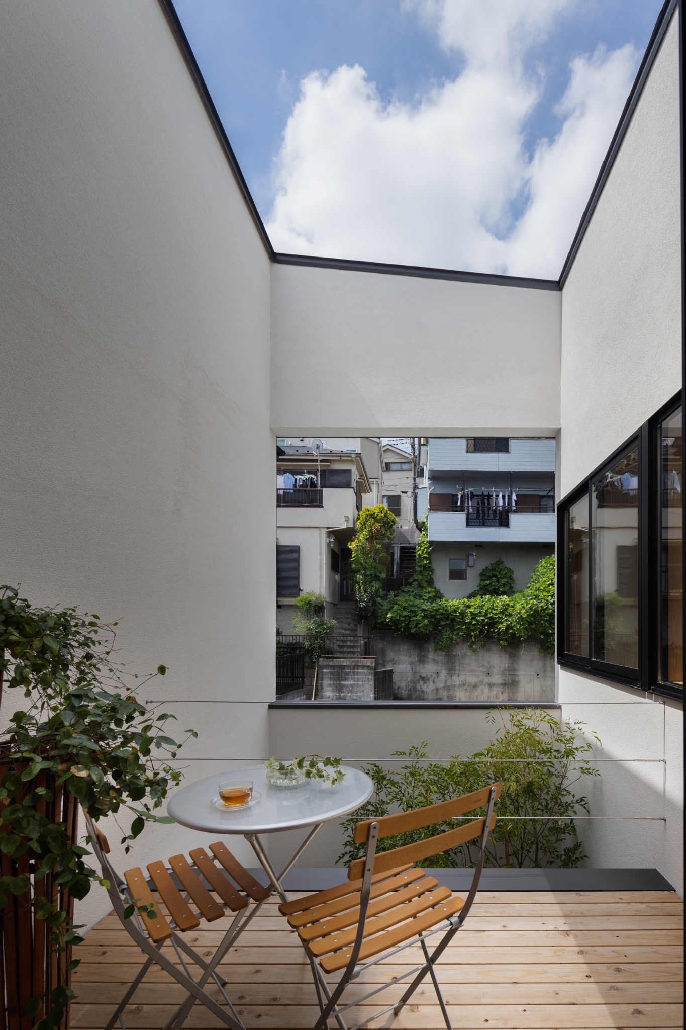 丘の眺望、光注ぎ風が抜ける光庭。北山檜、楢、タモ、檜、杉を主材とした、猫と暮らす夫婦の家