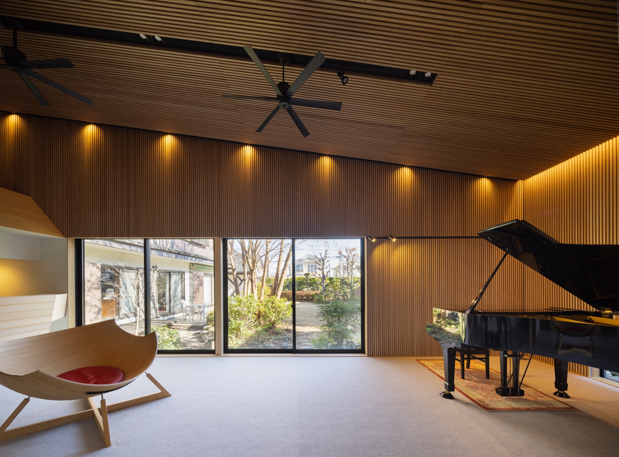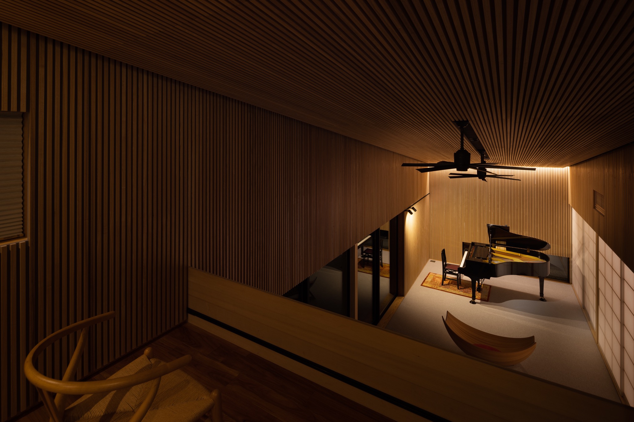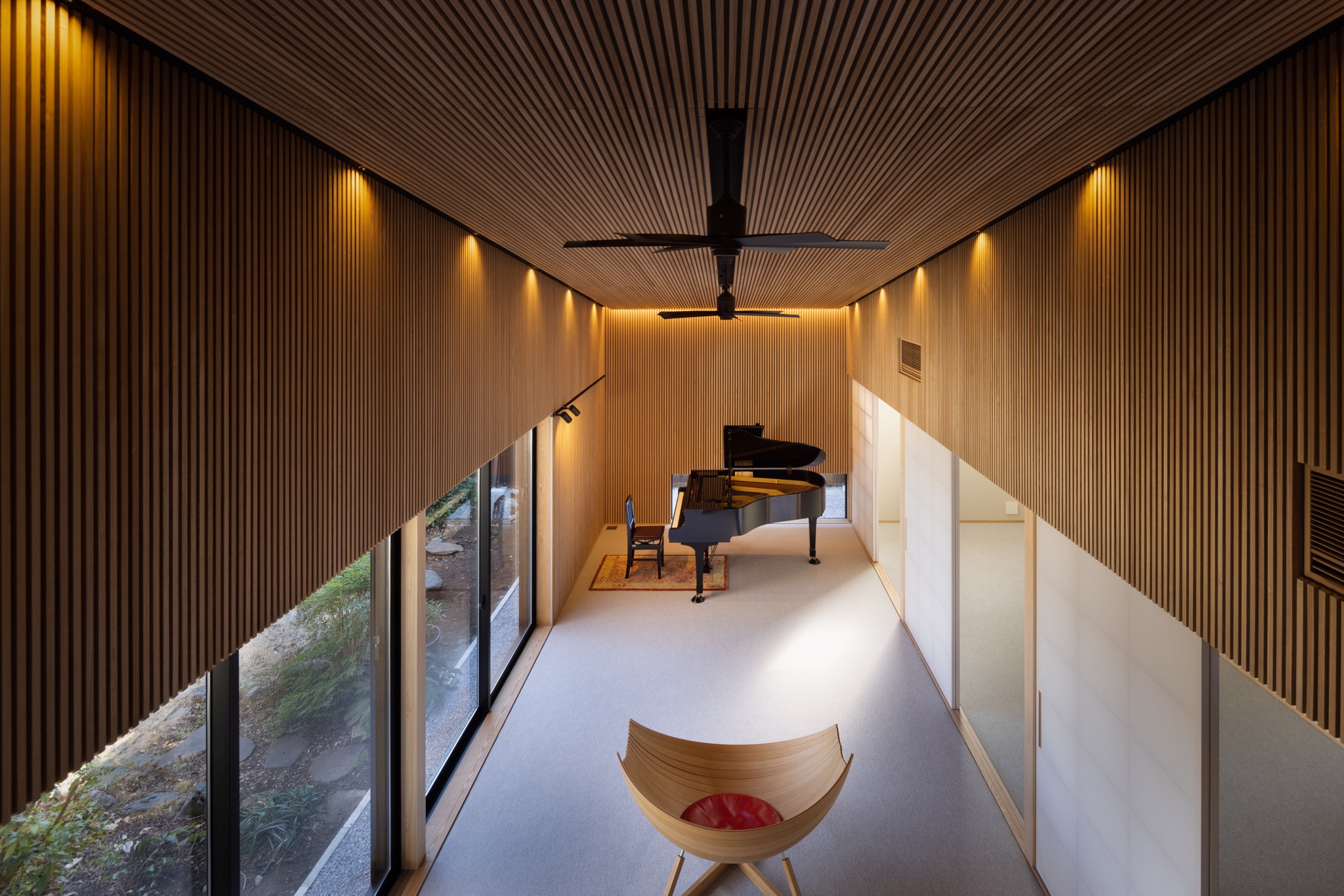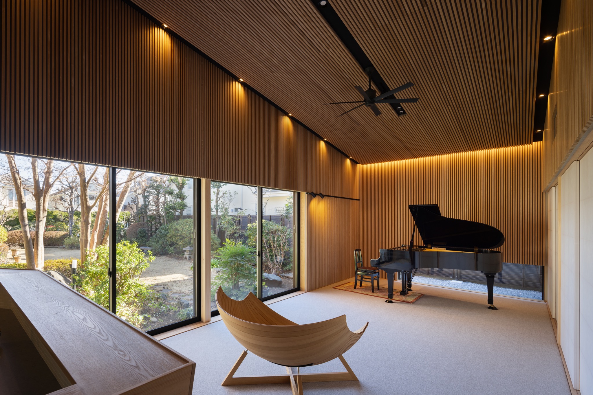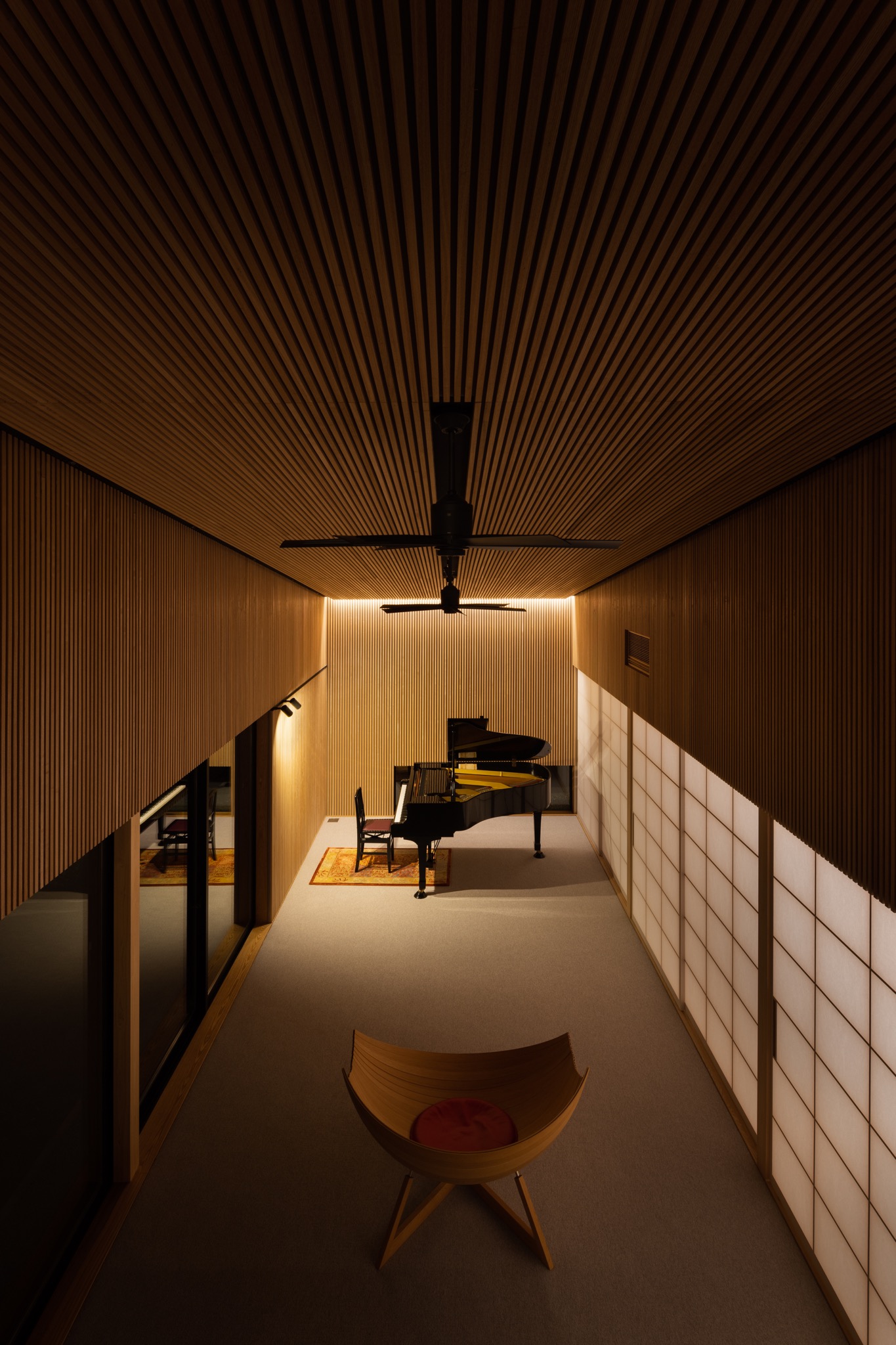 木格子のホールと檜梁のオフィス。ビルマチーク、タモ、檜、ブラックウォールナットを主材とした、作曲家の為のサロン。