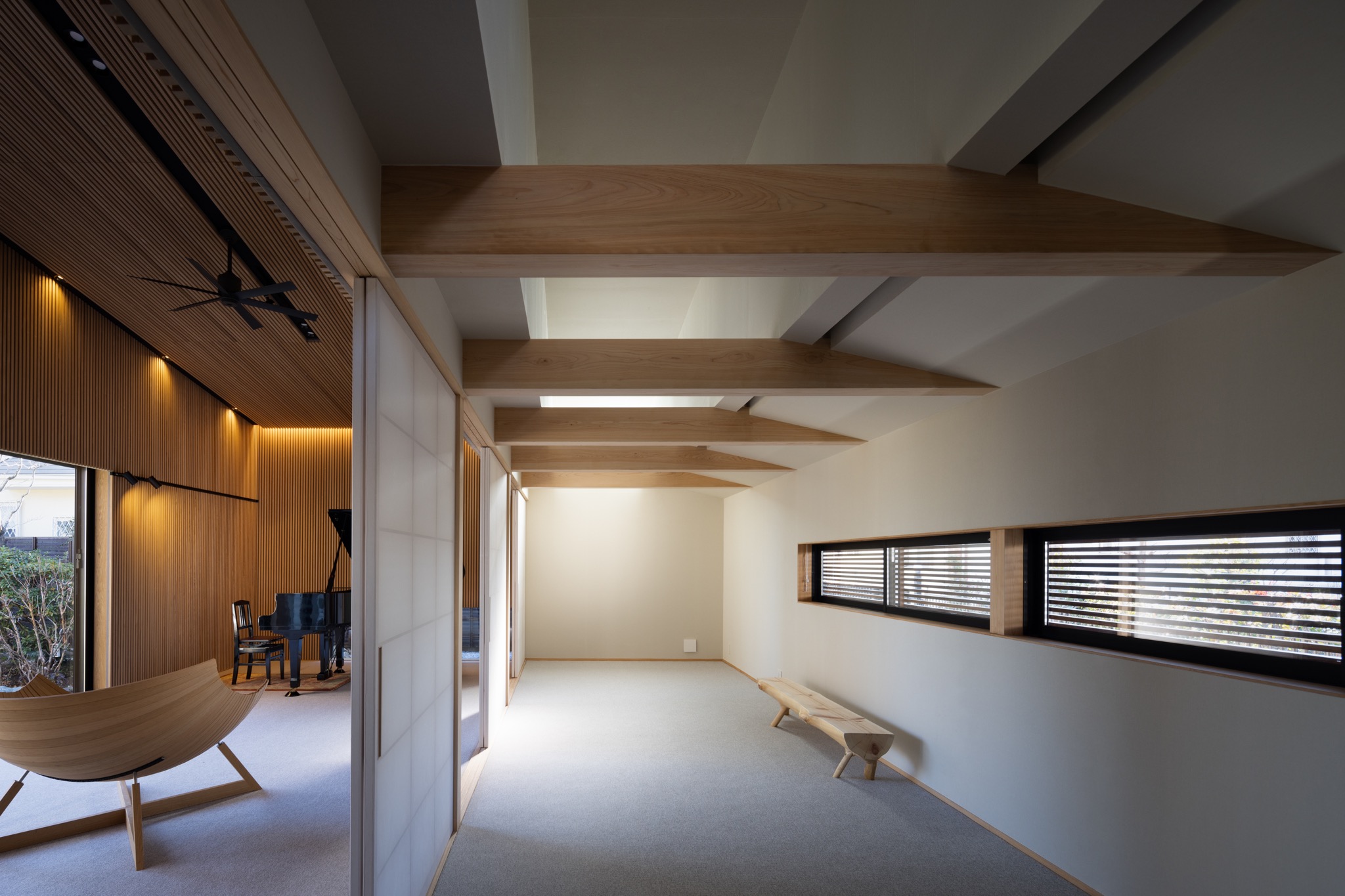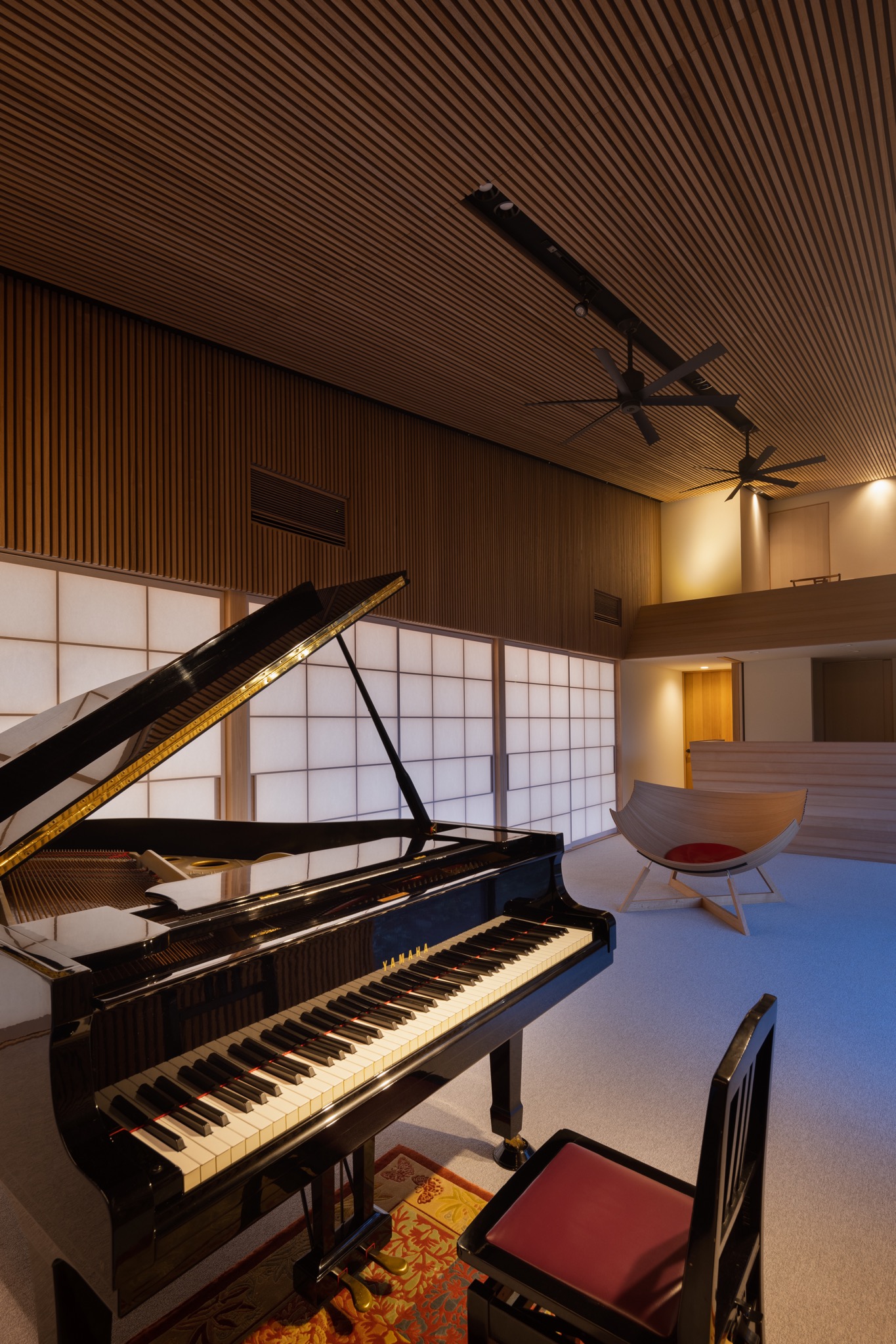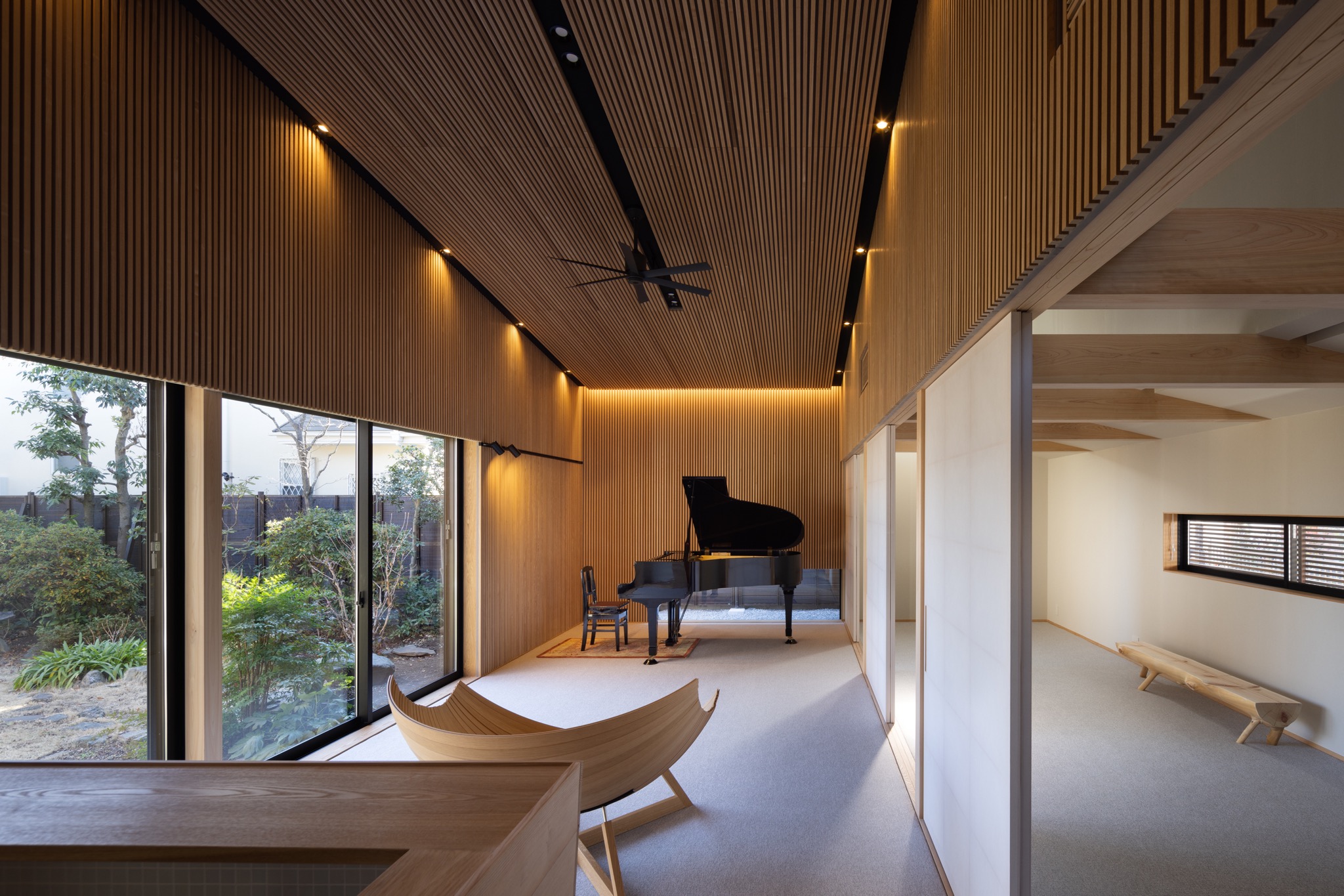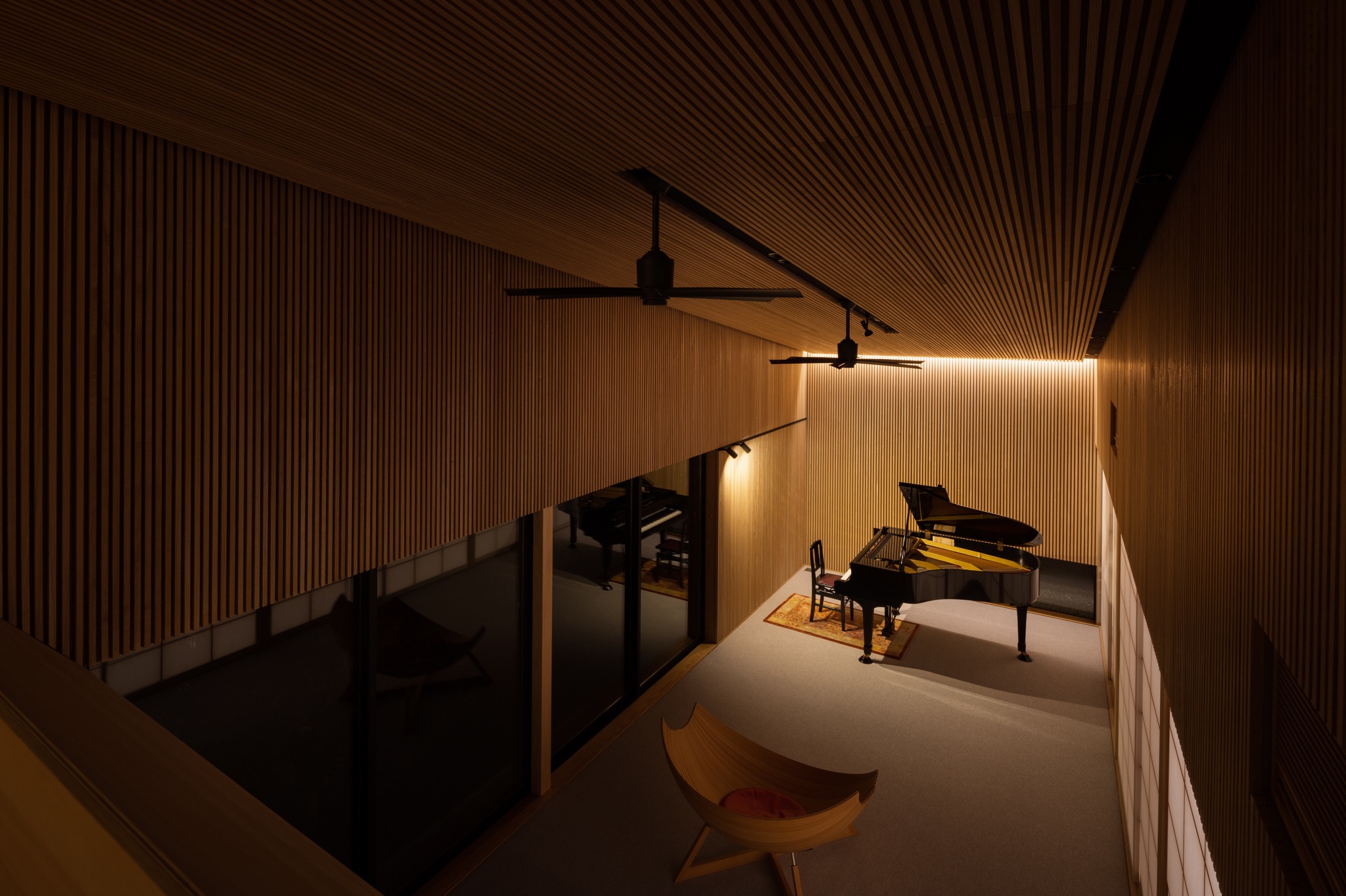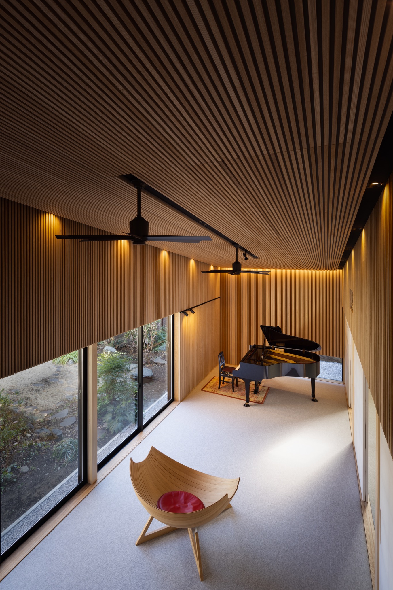 木格子のホールと檜梁のオフィス。ビルマチーク、タモ、檜、ブラックウォールナットを主材とした、作曲家の為のサロン。