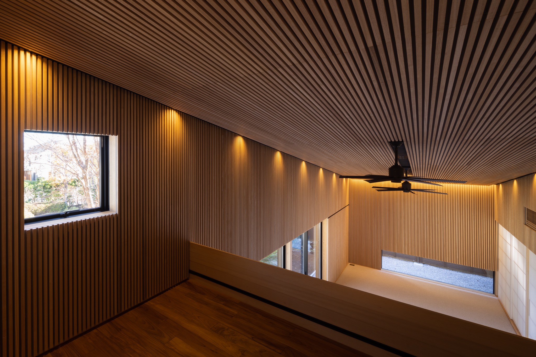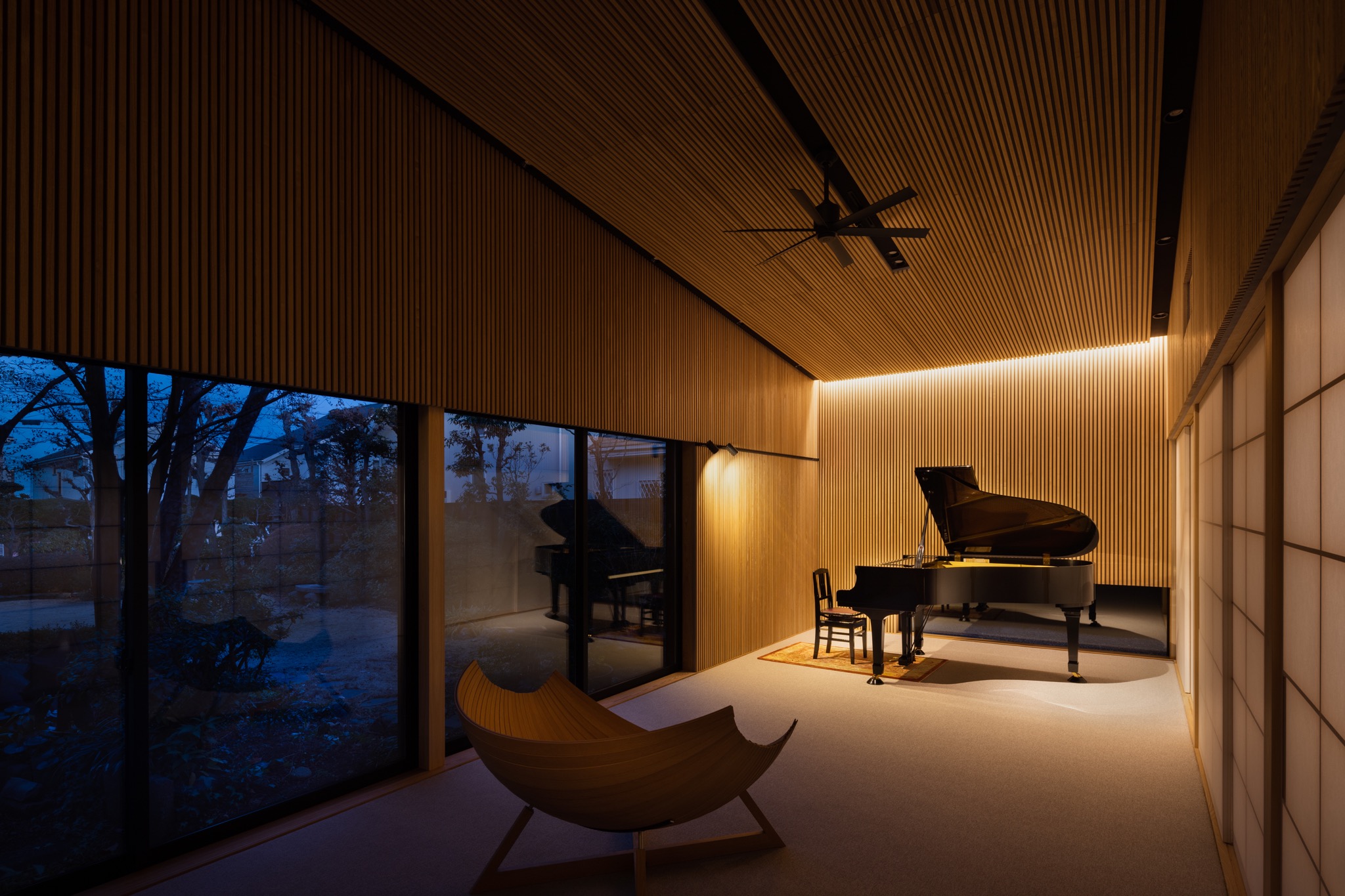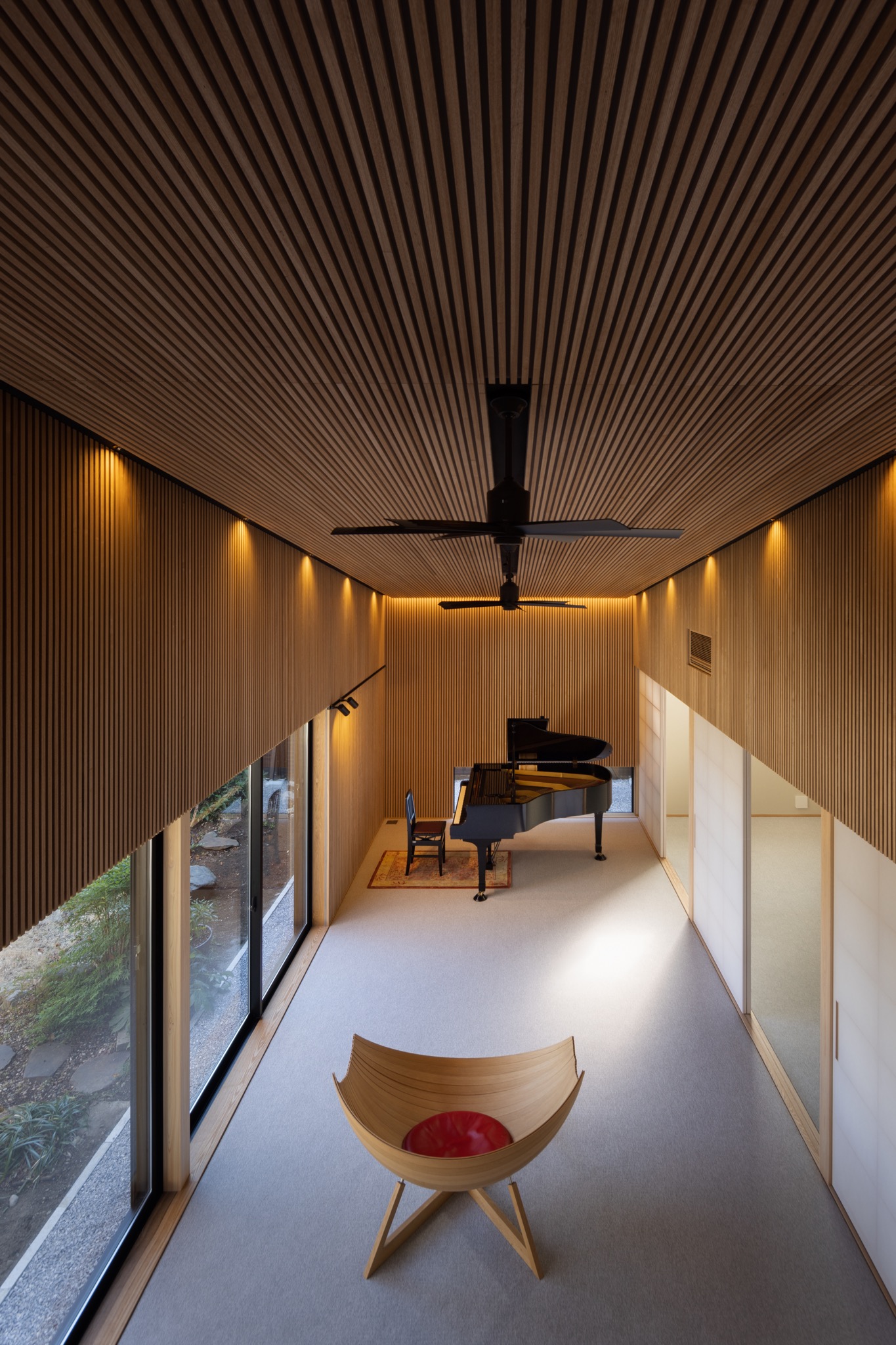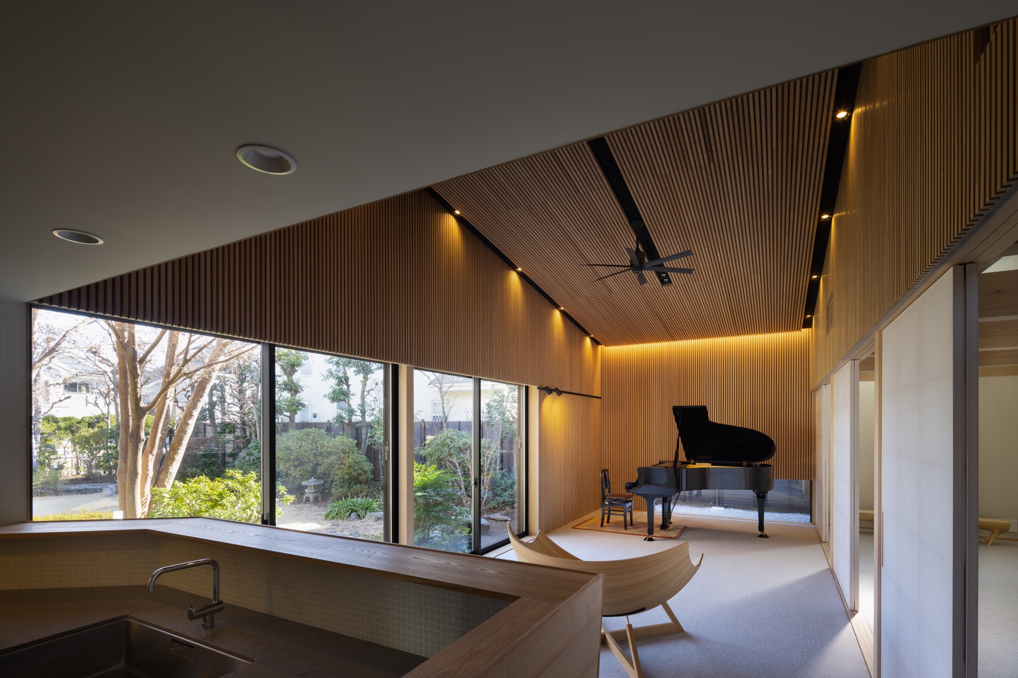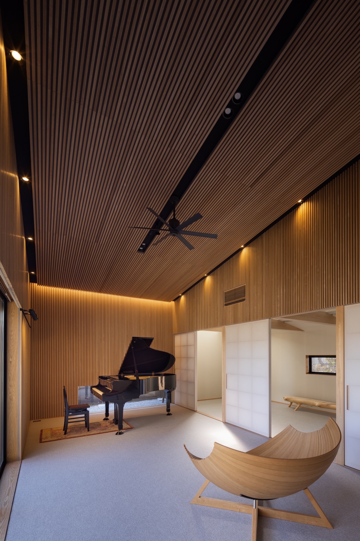 木格子のホールと檜梁のオフィス。ビルマチーク、タモ、檜、ブラックウォールナットを主材とした、作曲家の為のサロン。