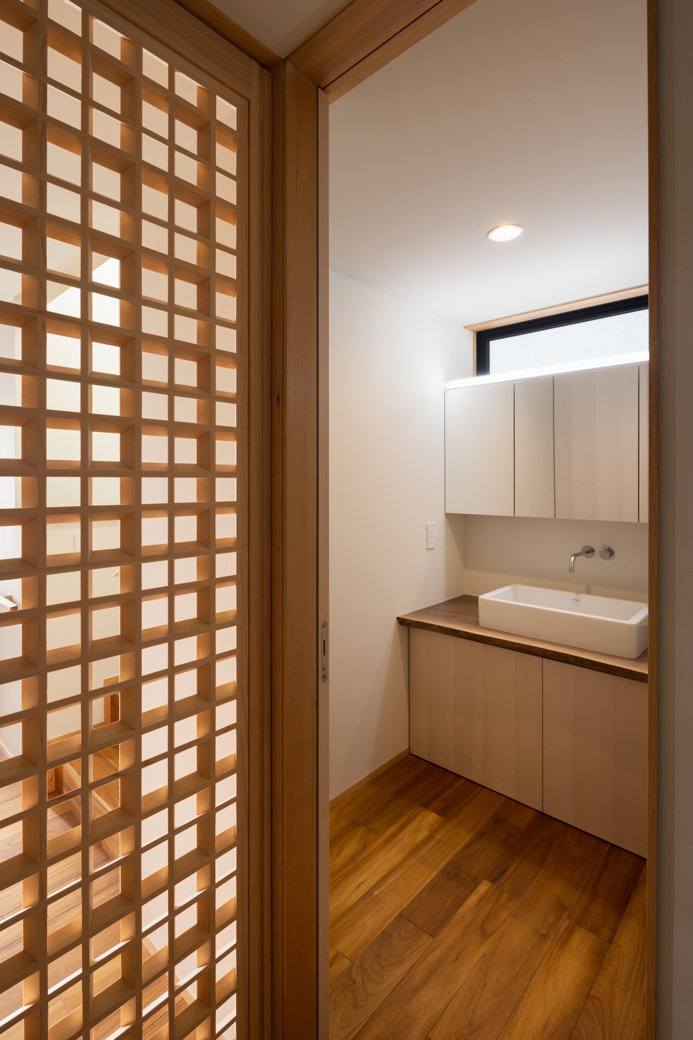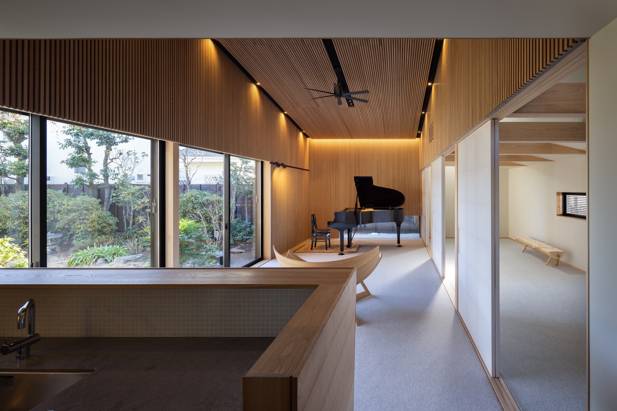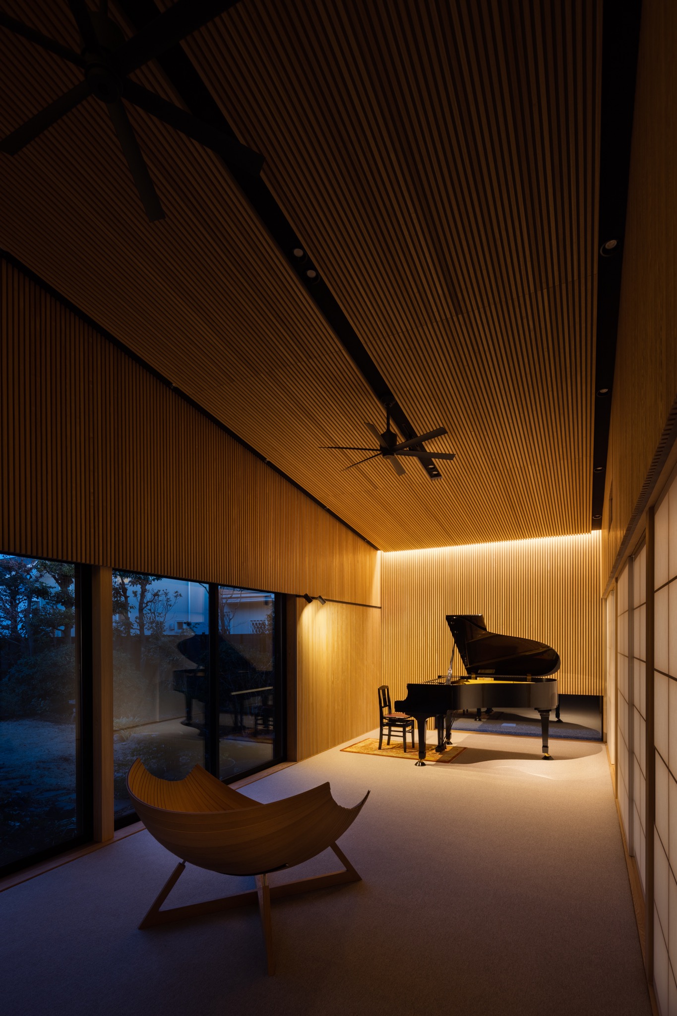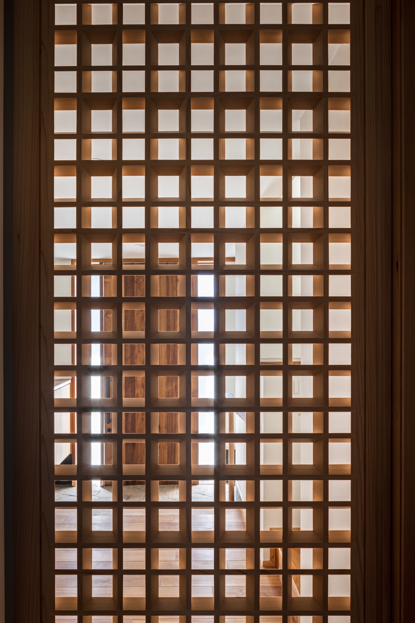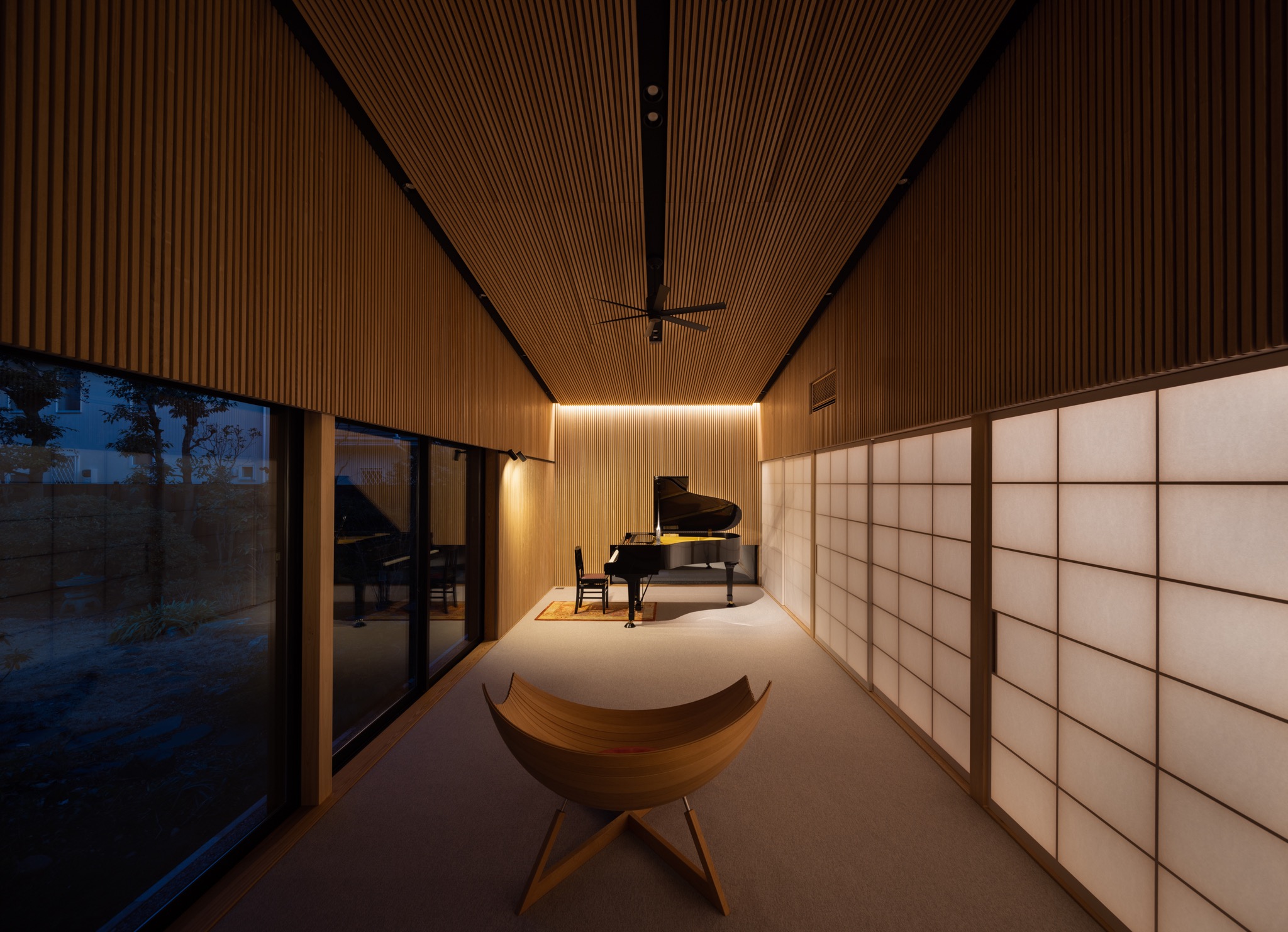 木格子のホールと檜梁のオフィス。ビルマチーク、タモ、檜、ブラックウォールナットを主材とした、作曲家の為のサロン。