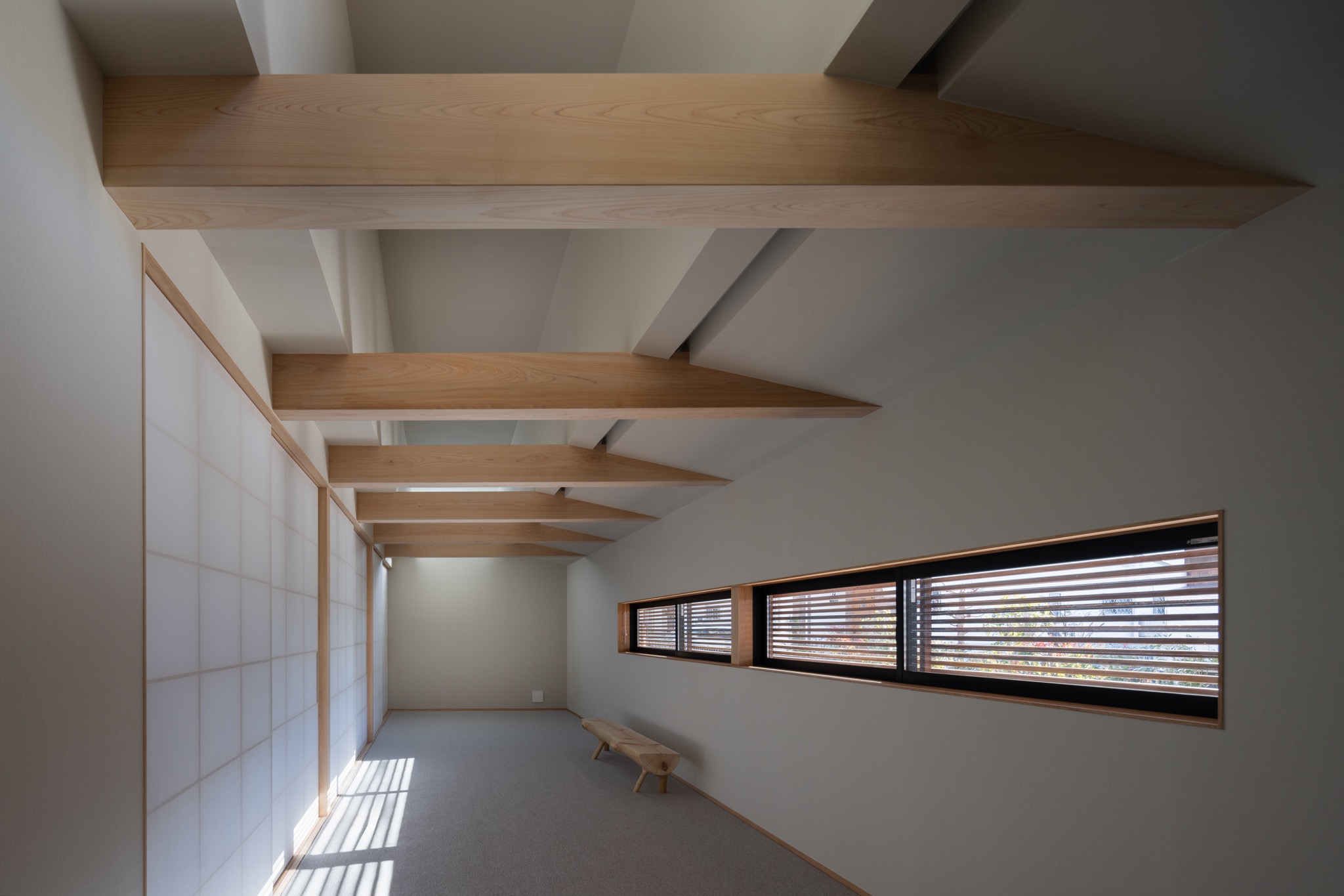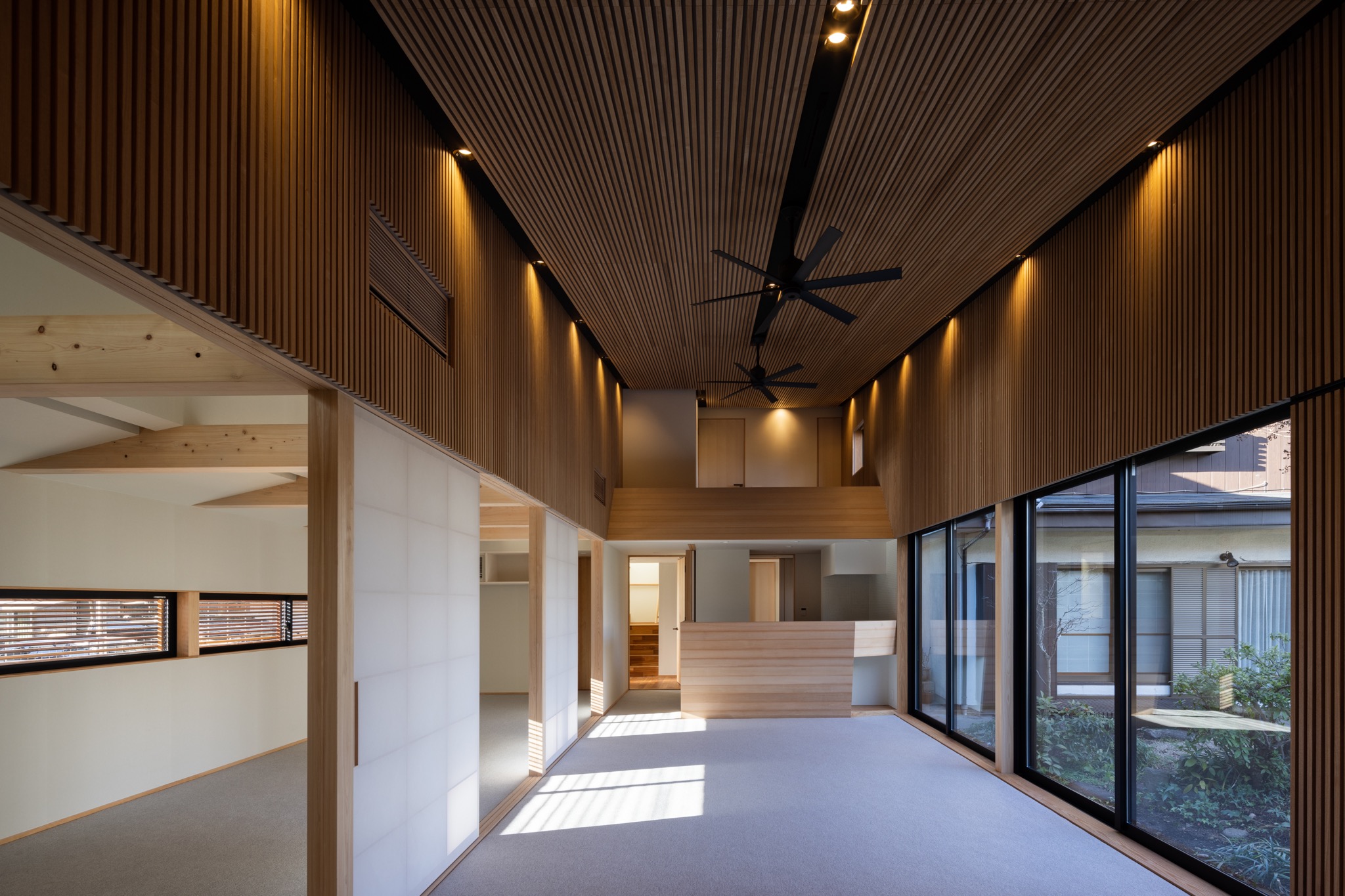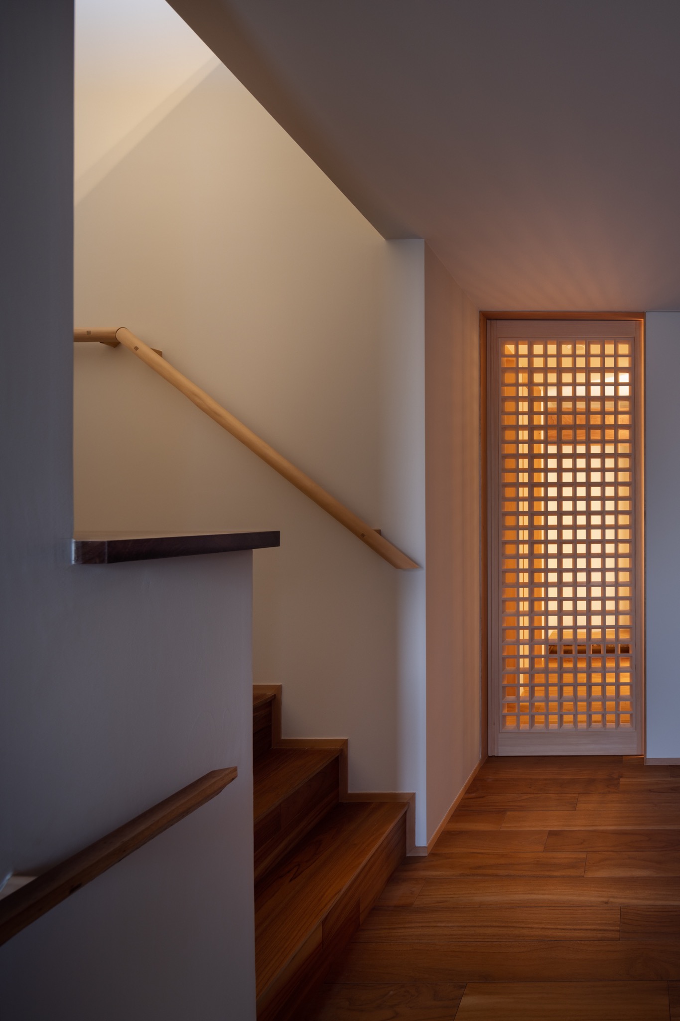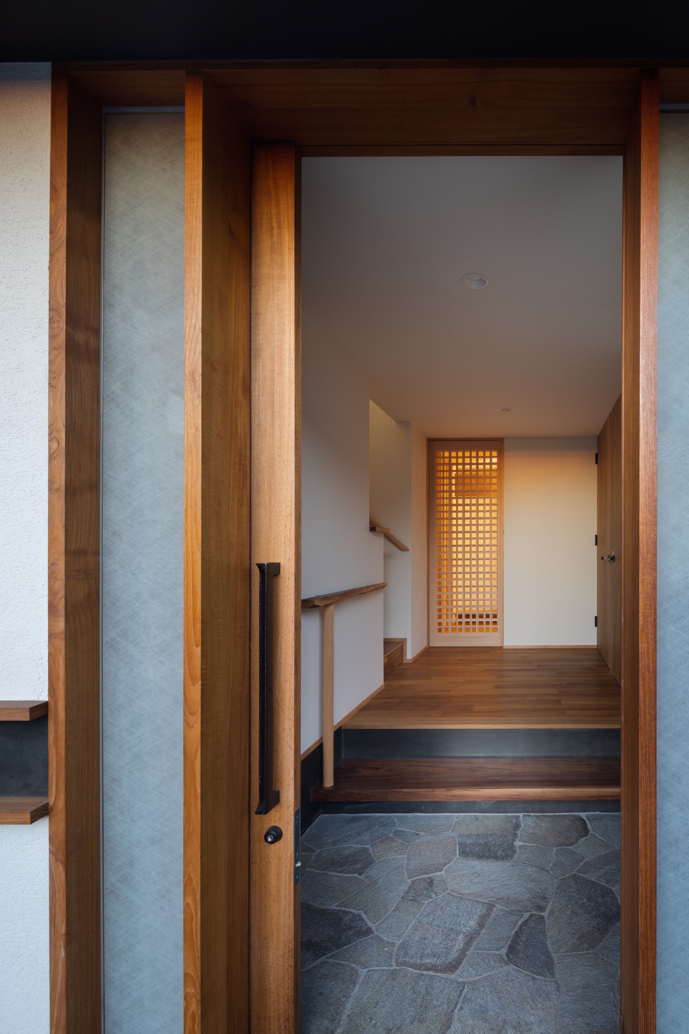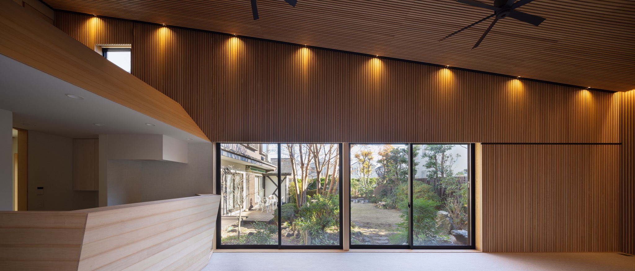 木格子のホールと檜梁のオフィス。ビルマチーク、タモ、檜、ブラックウォールナットを主材とした、作曲家の為のサロン。
