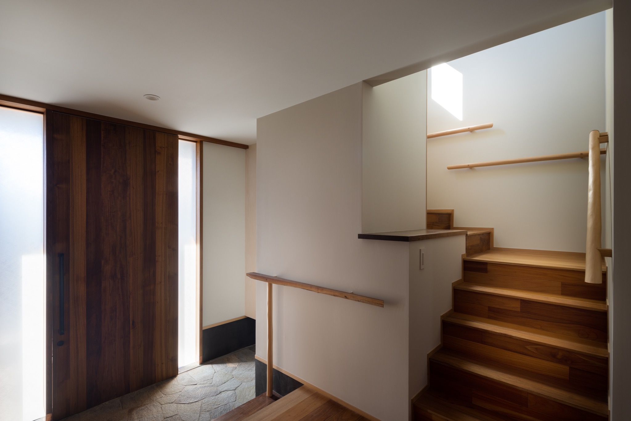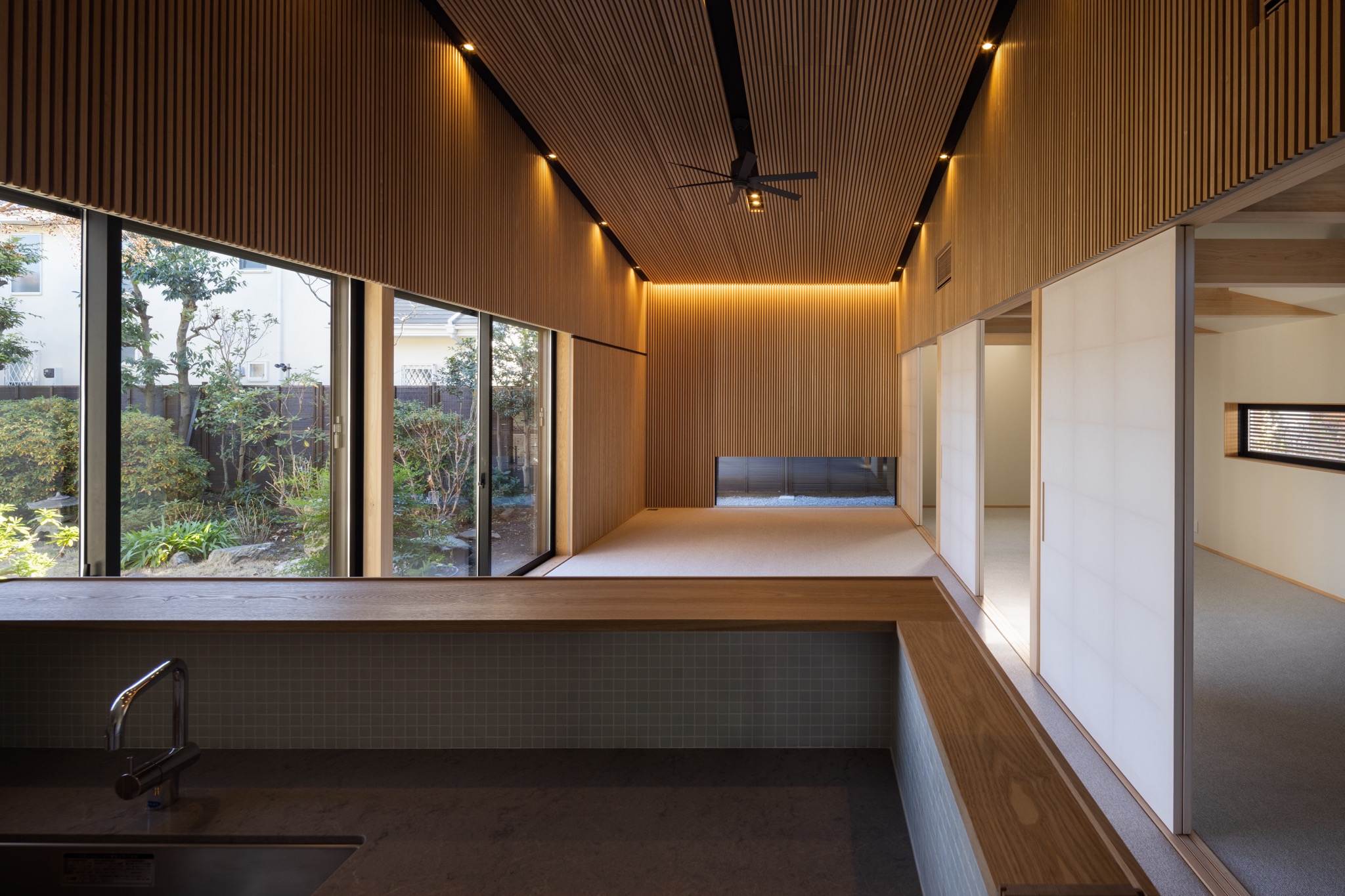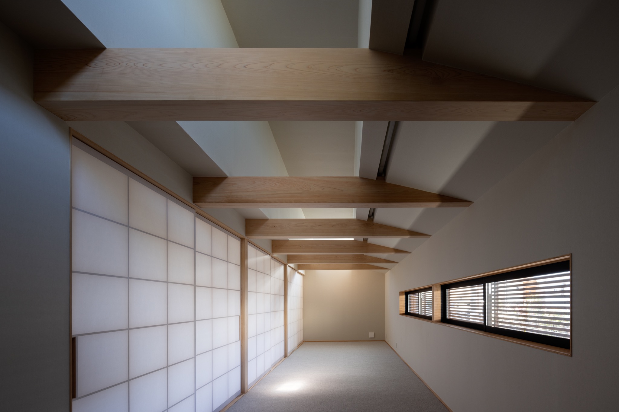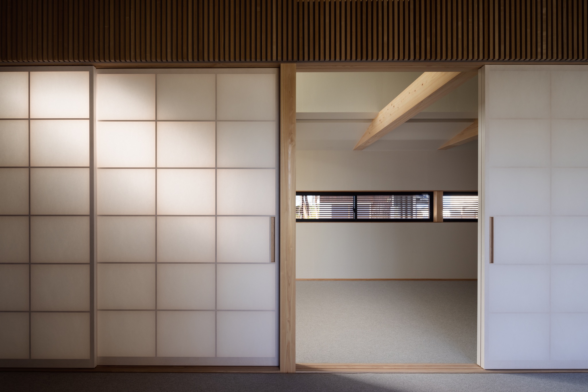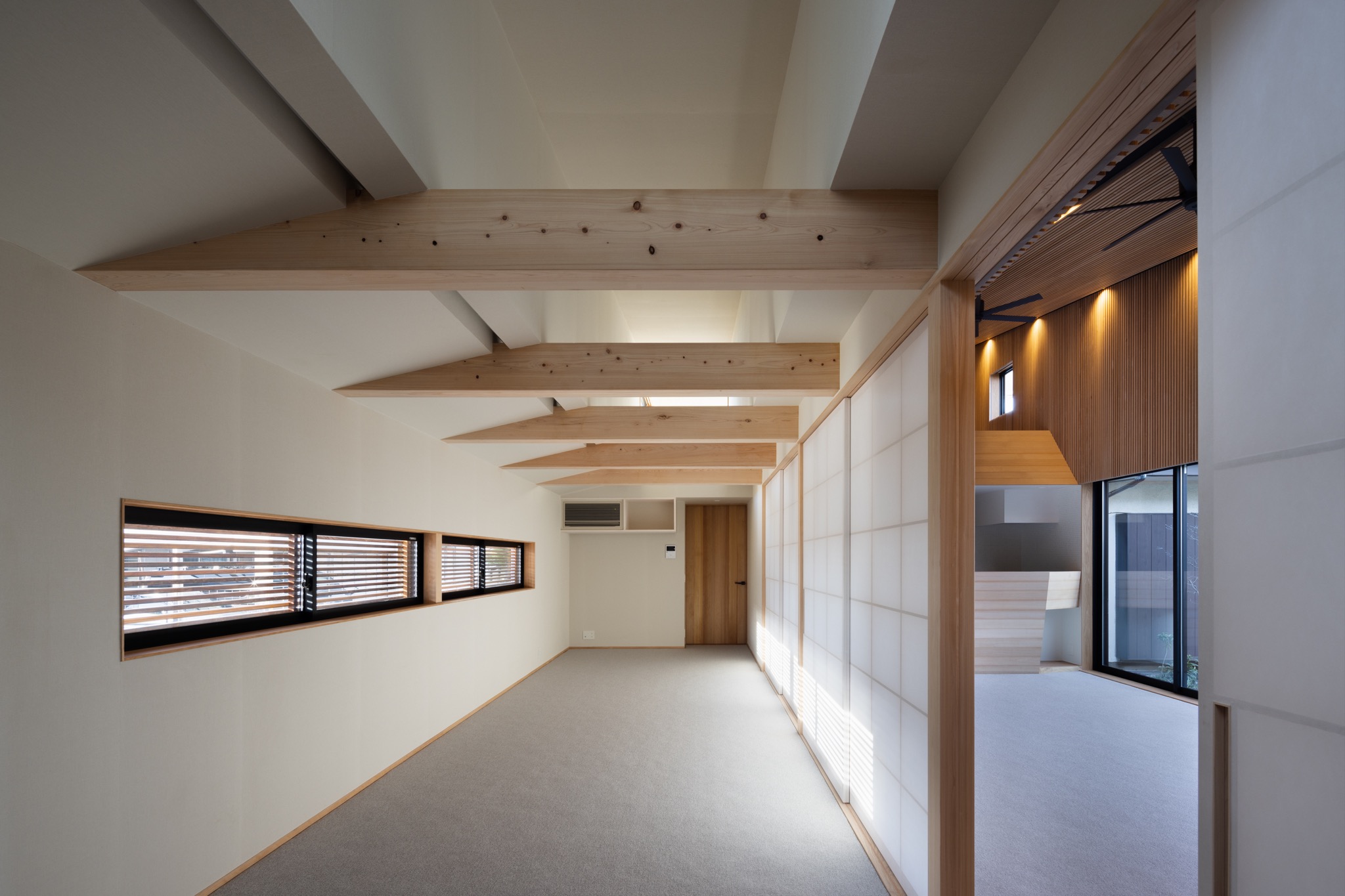 木格子のホールと檜梁のオフィス。ビルマチーク、タモ、檜、ブラックウォールナットを主材とした、作曲家の為のサロン。