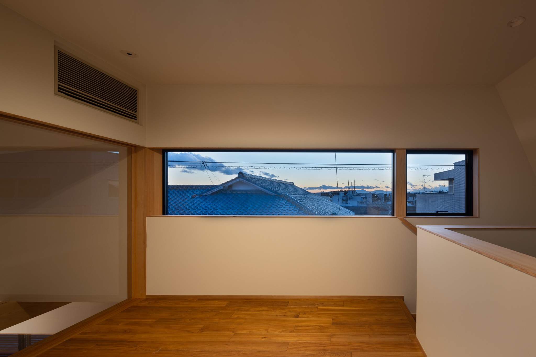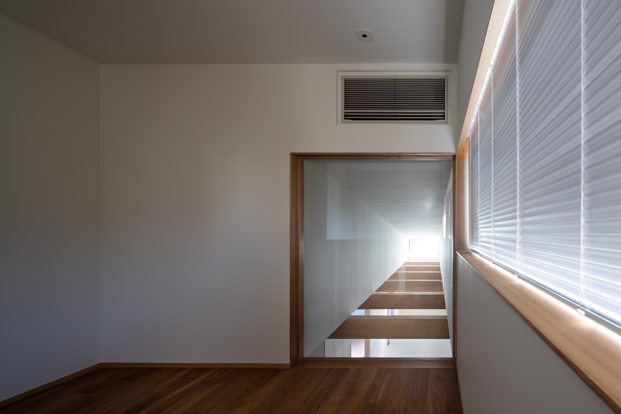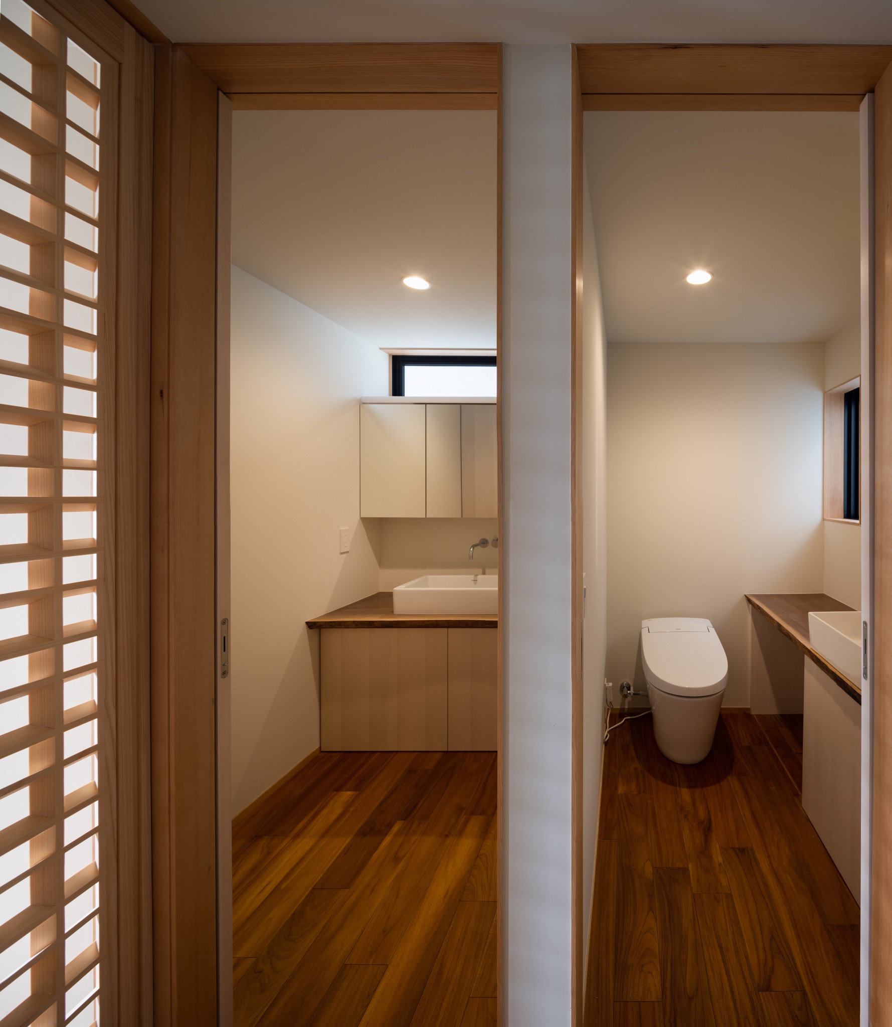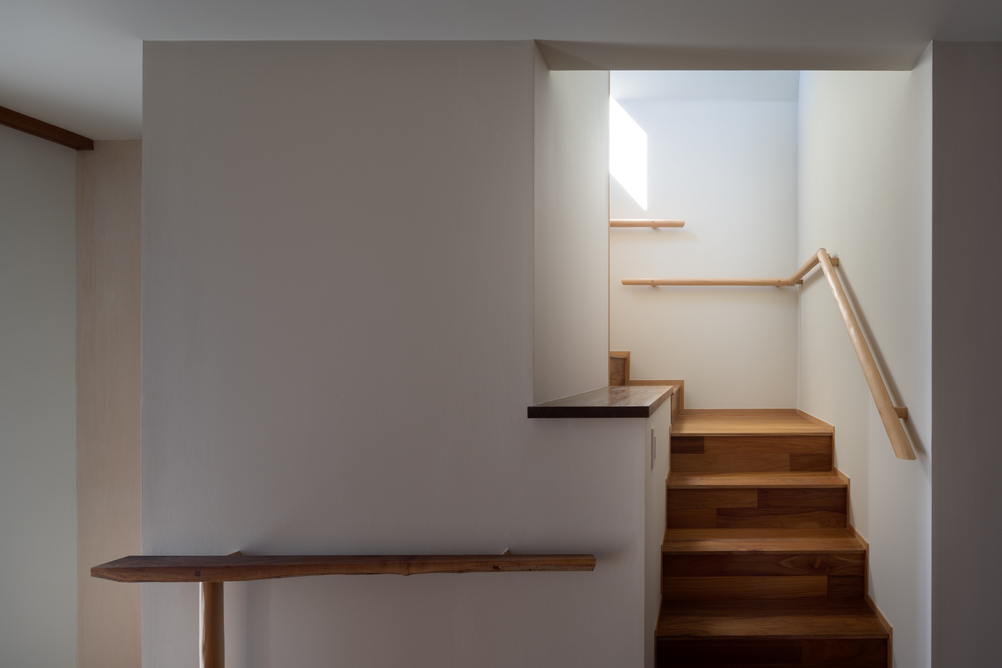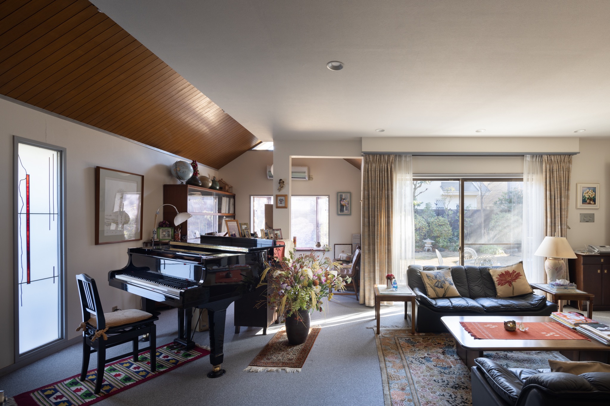 木格子のホールと檜梁のオフィス。ビルマチーク、タモ、檜、ブラックウォールナットを主材とした、作曲家の為のサロン。