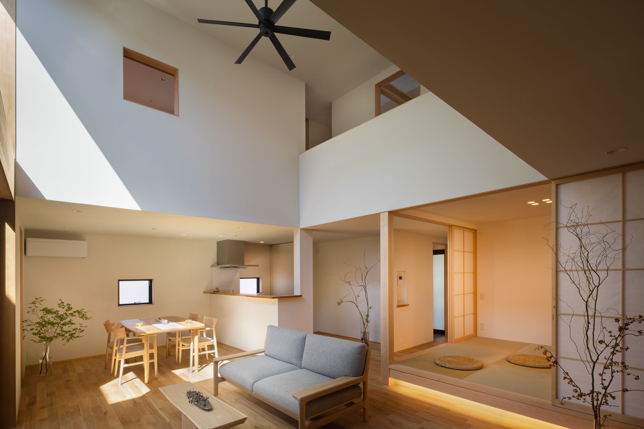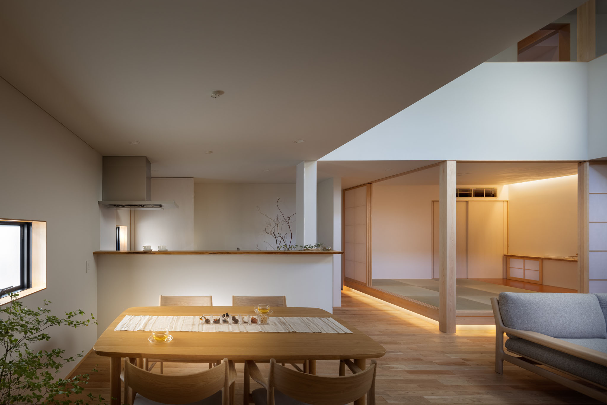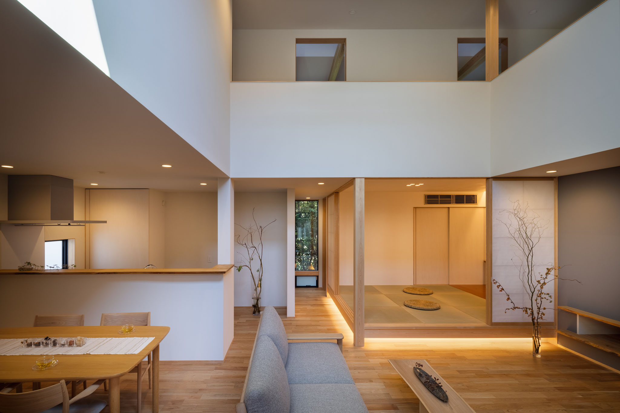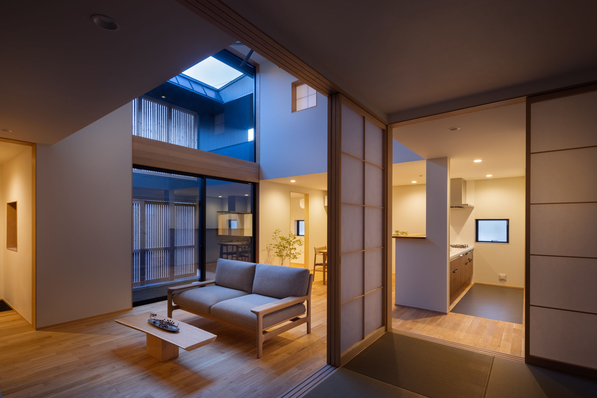和室~玄関ホール・リビングダイニング・吹抜・キッチン・光庭夕景