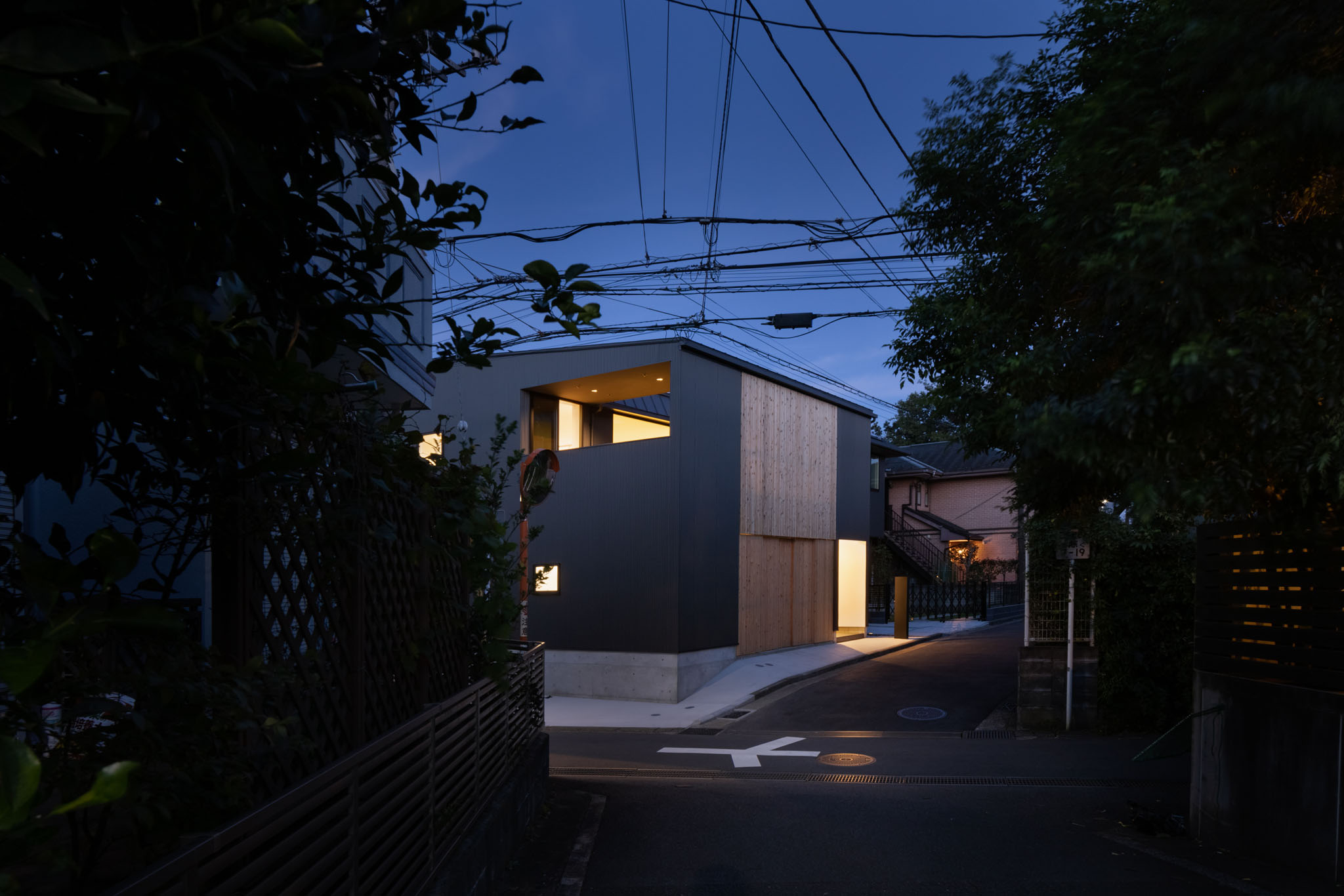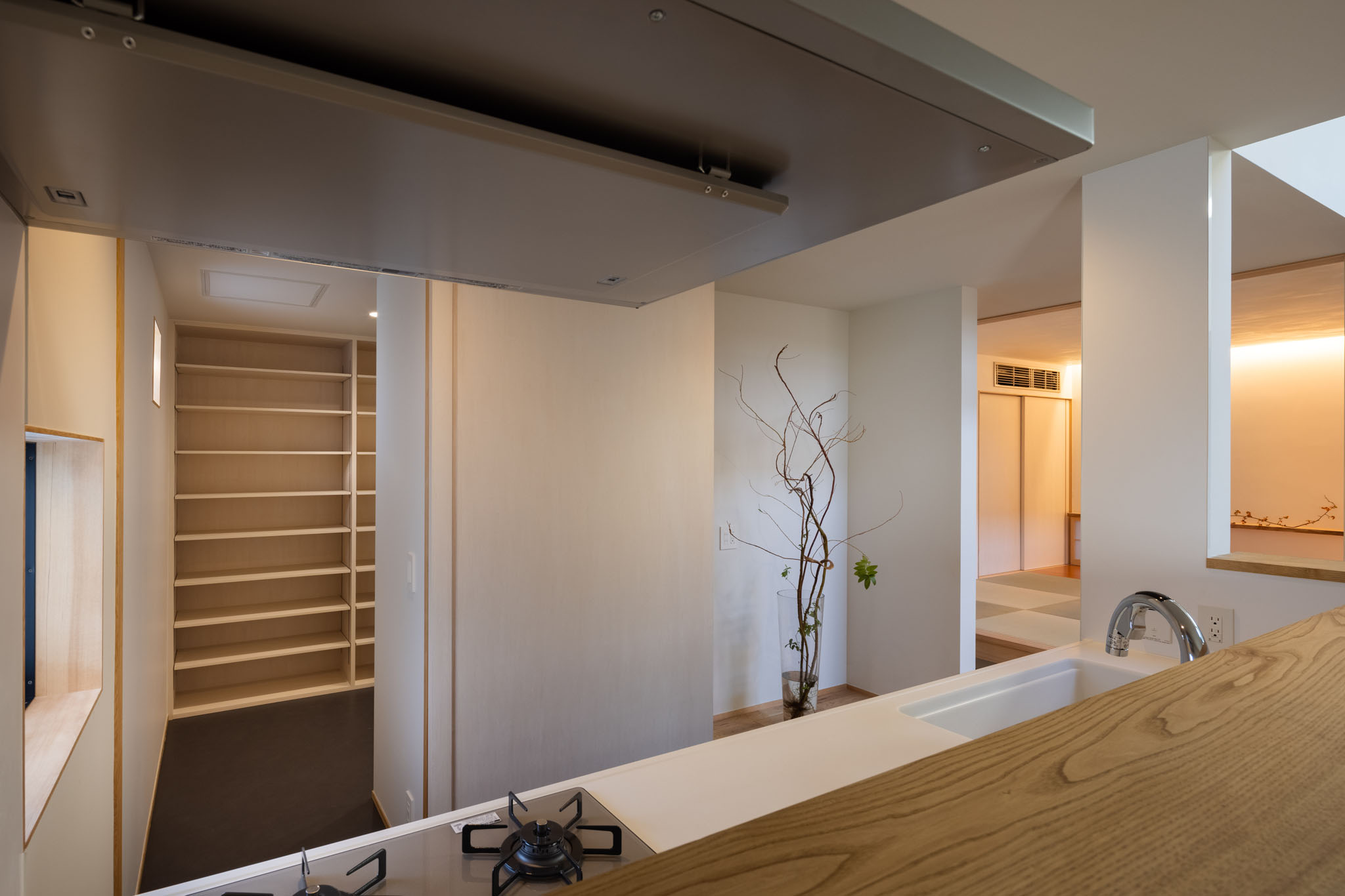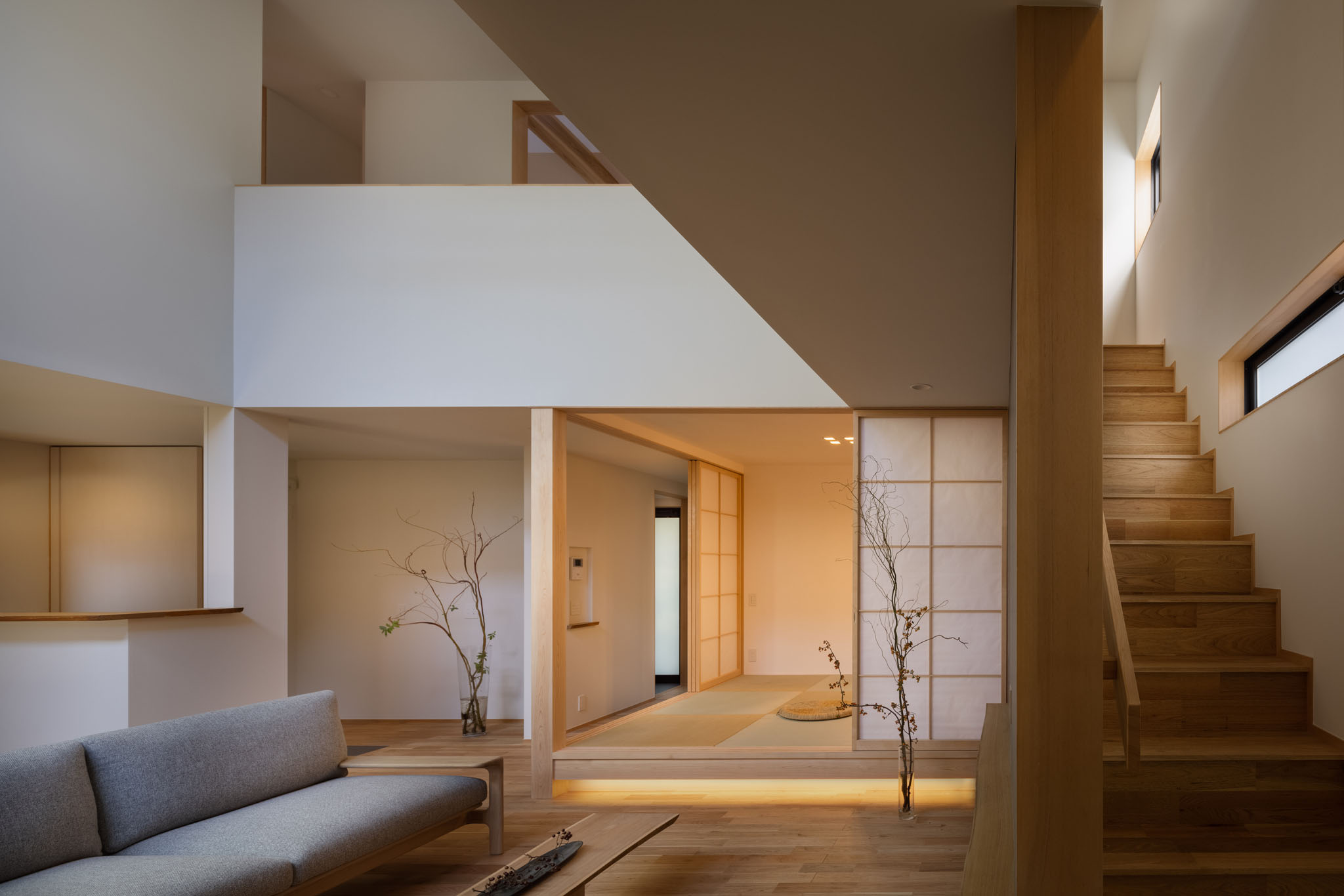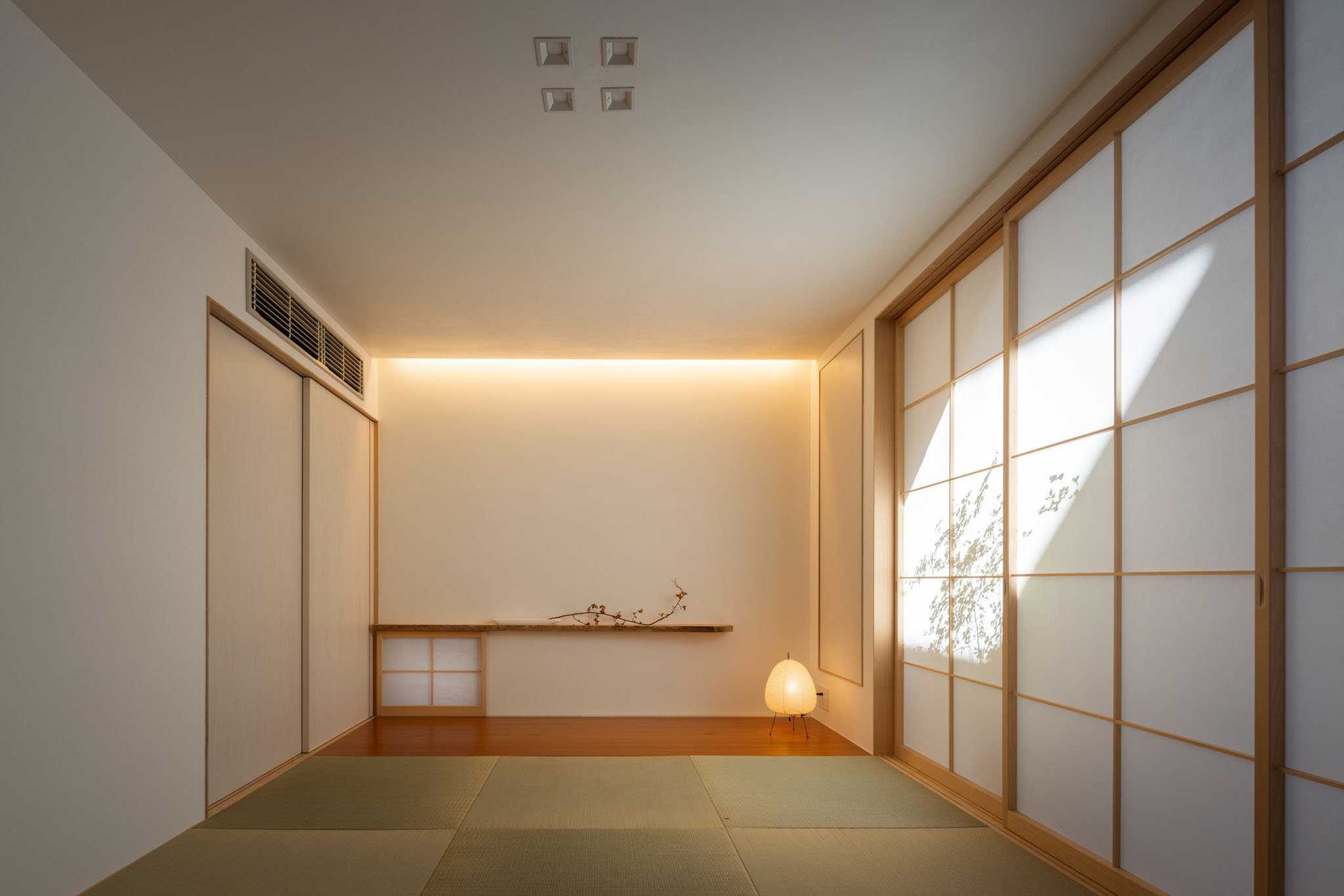 和室~玄関ホール・リビングダイニング・吹抜・キッチン・光庭夕景
