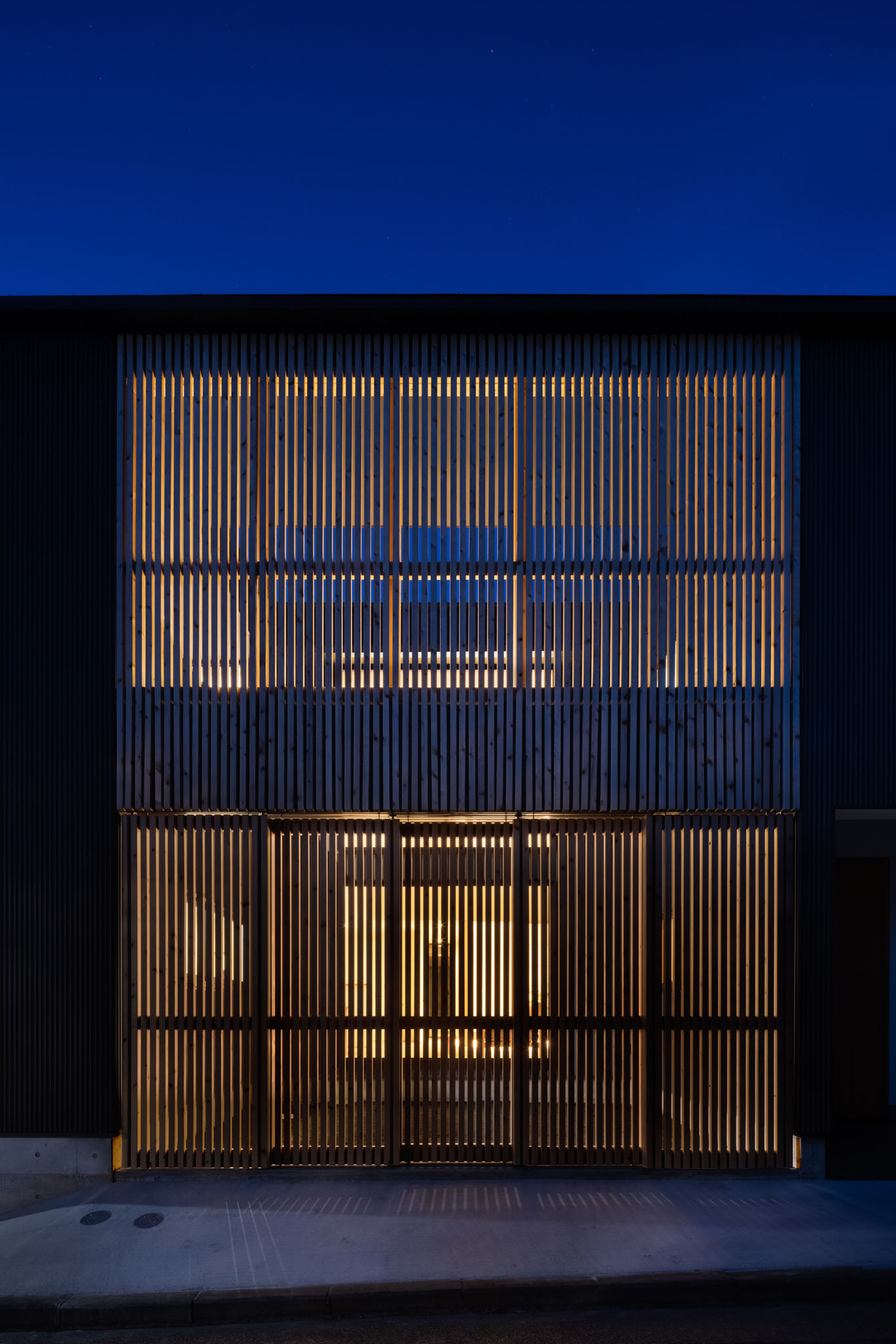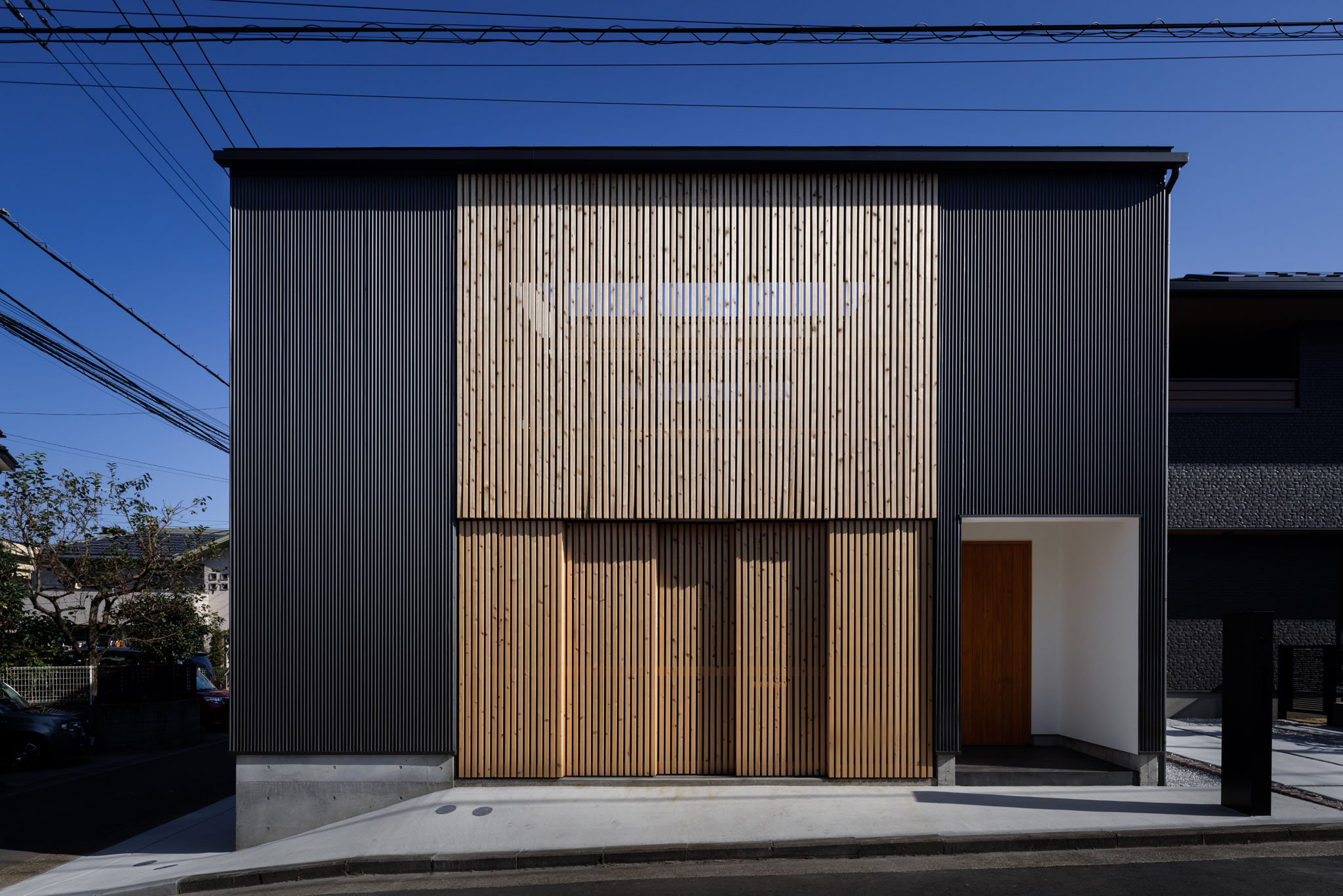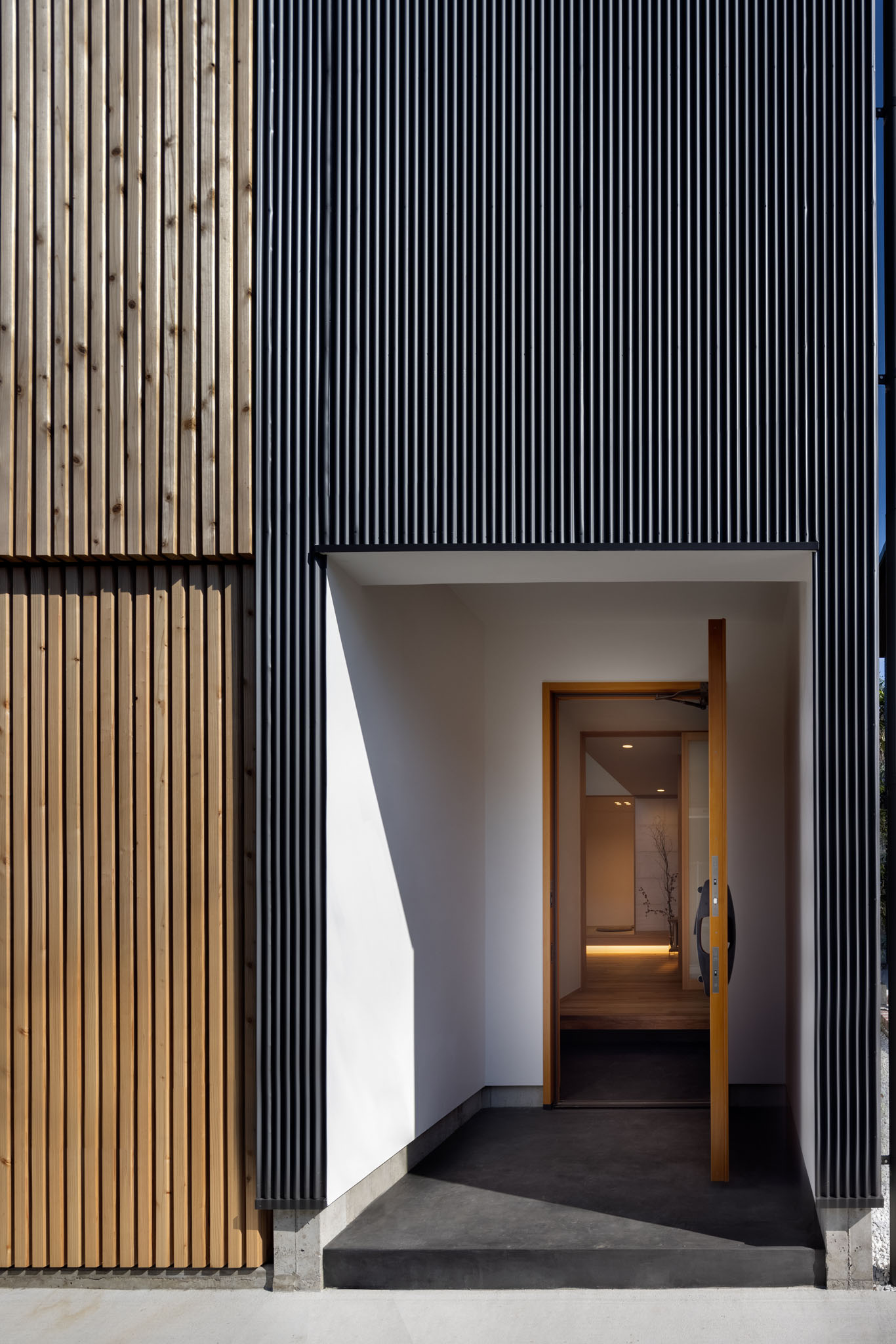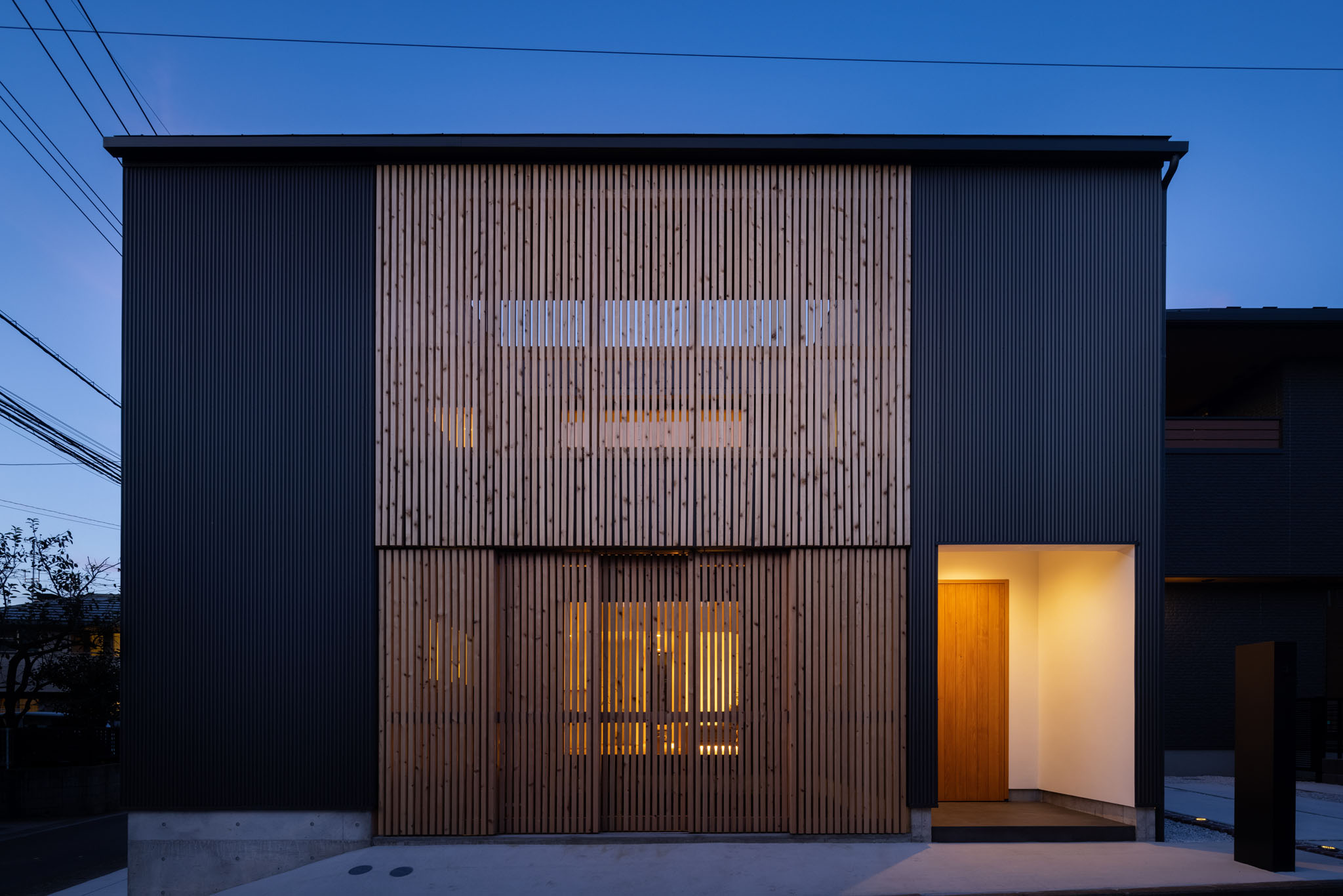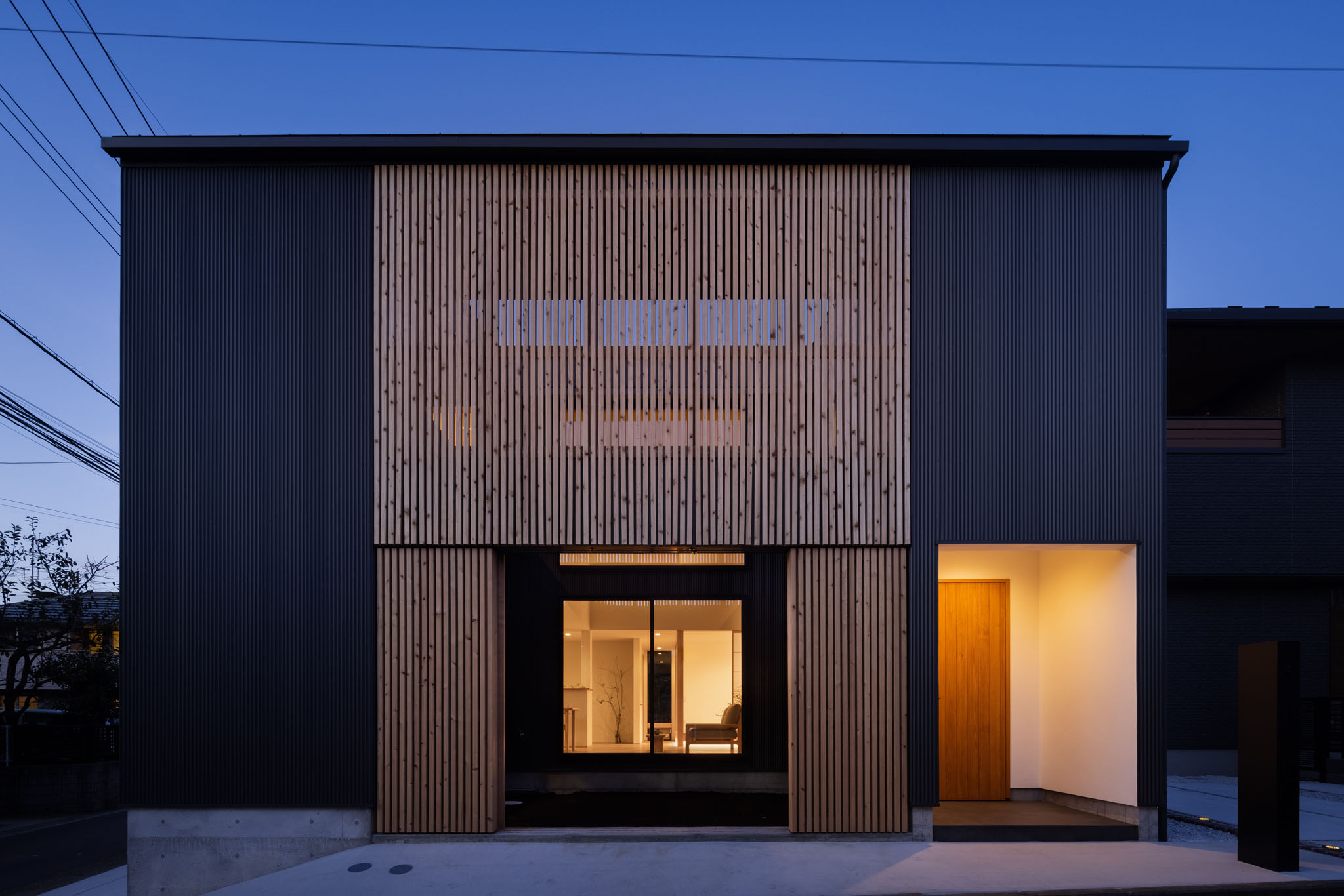 暮らしの安定を計る木格子扉。檜、杉、胡桃、栗、欅、山桜を主材とし、吹抜けを中心に新しい家族を育む家。