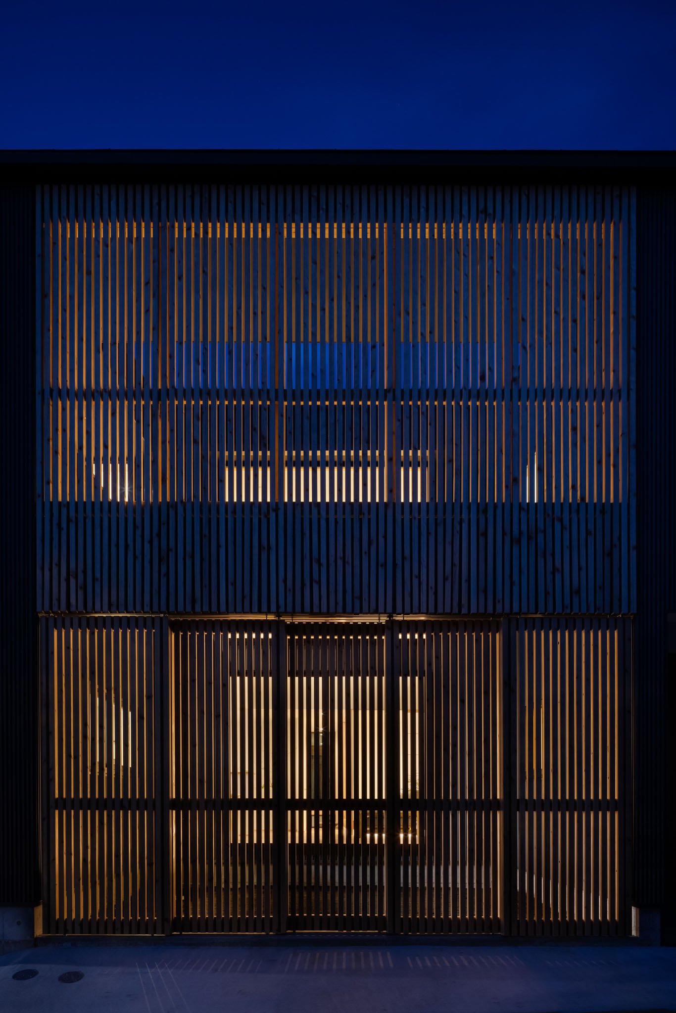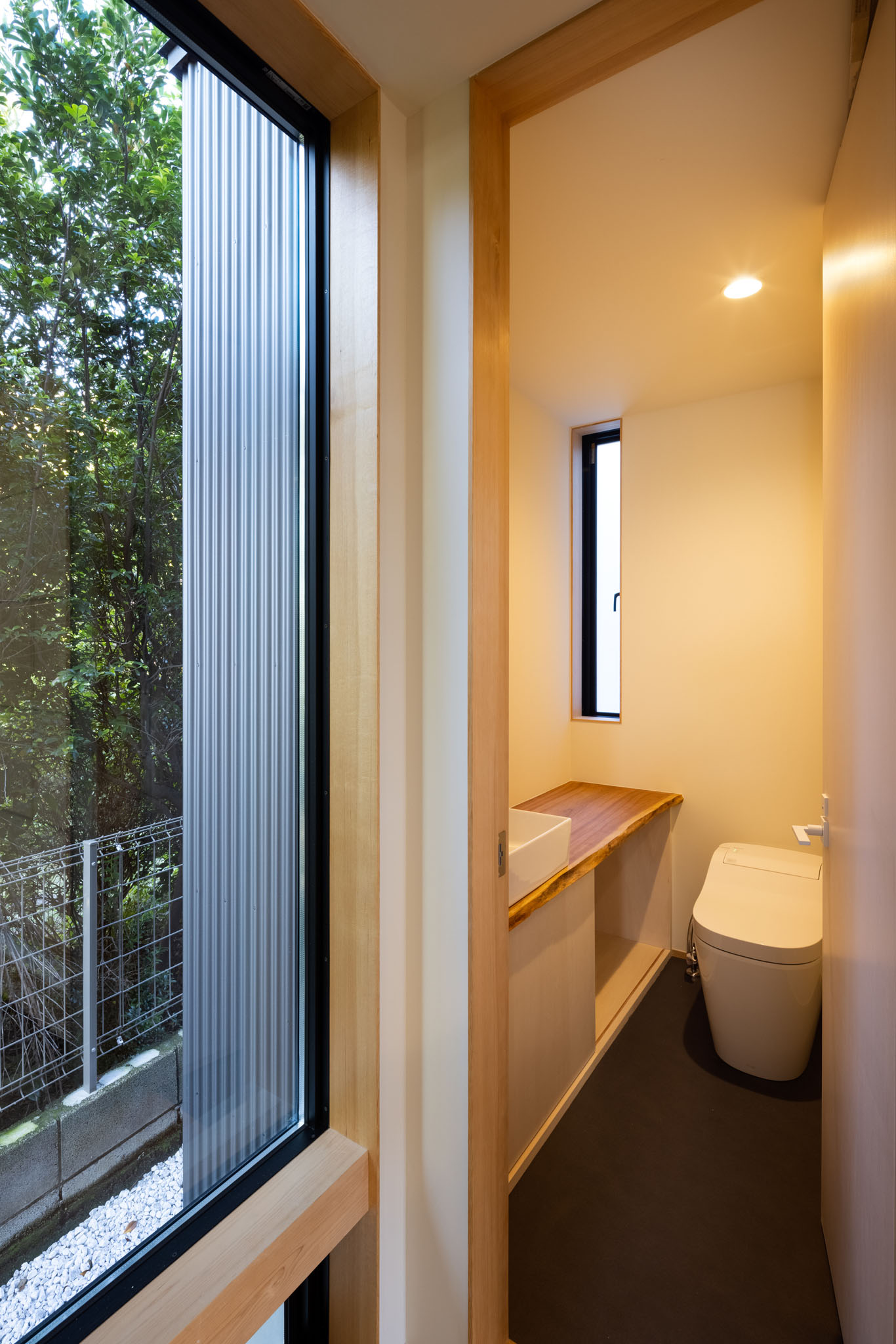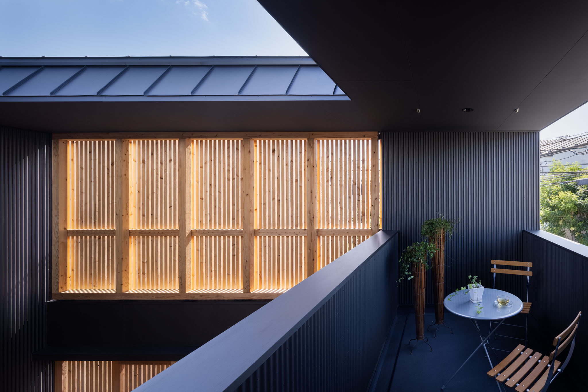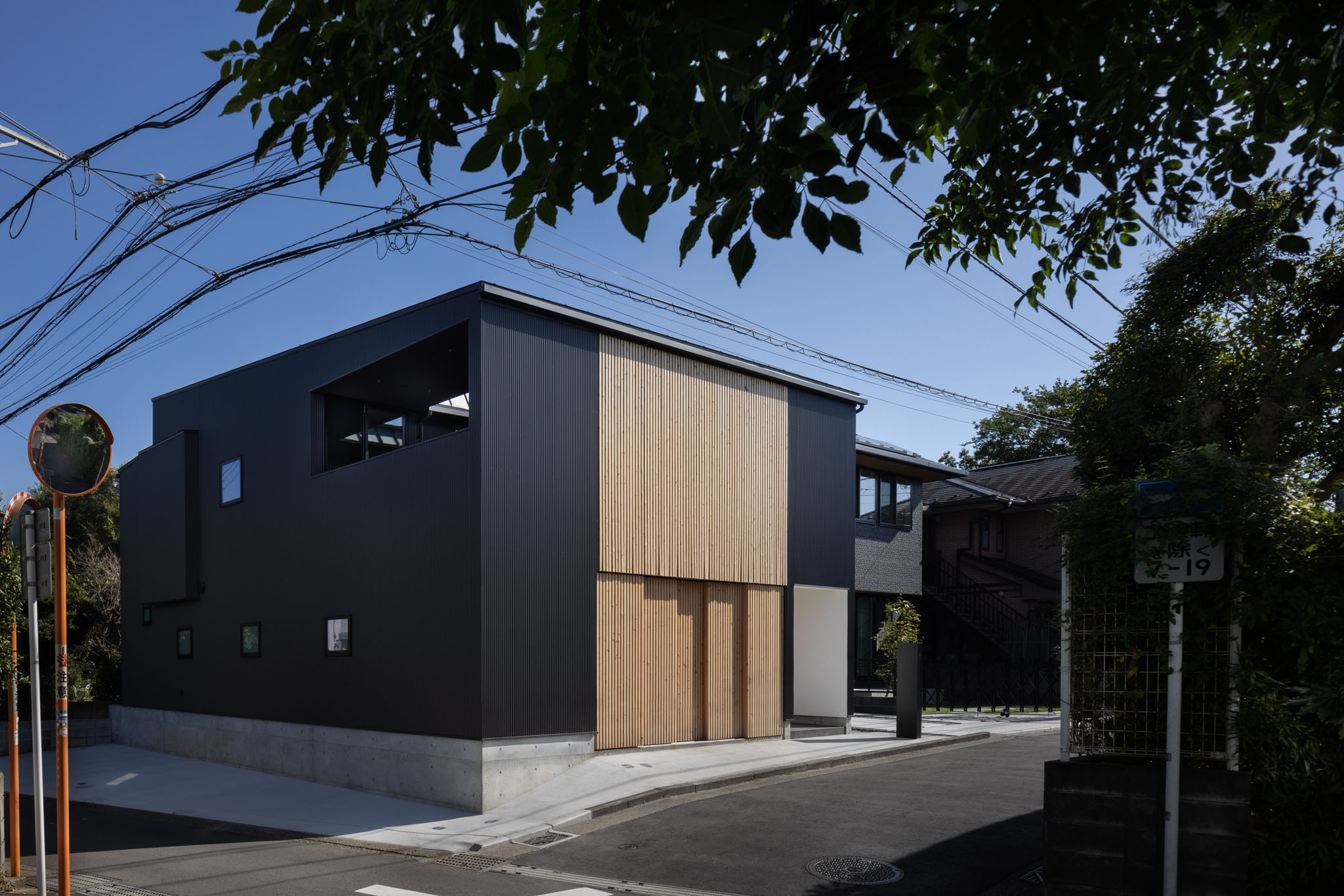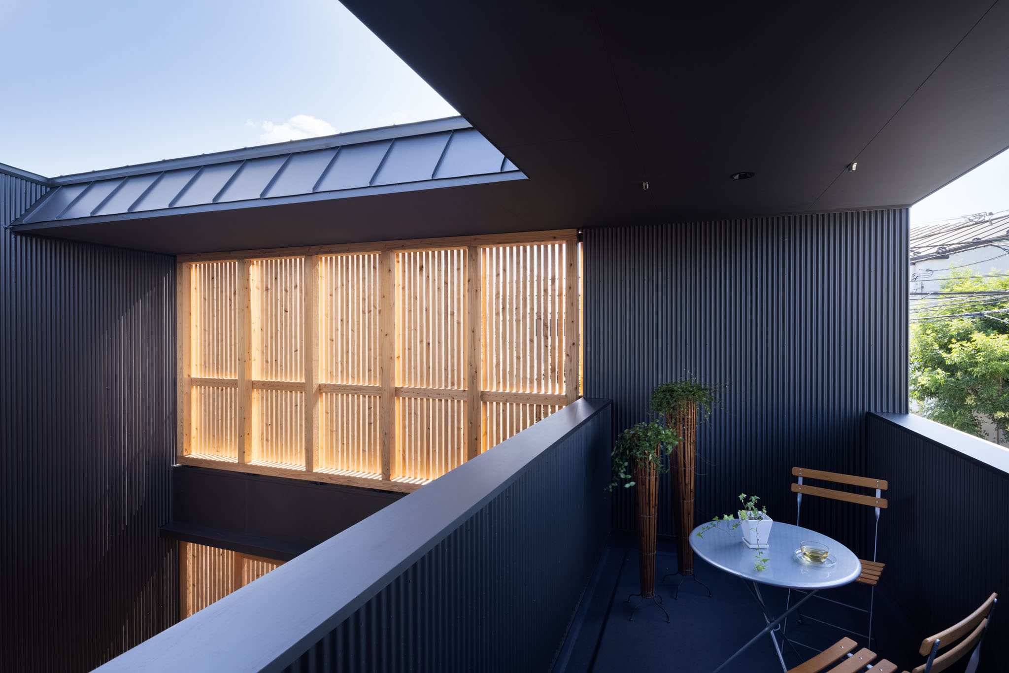 暮らしの安定を計る木格子扉。檜、杉、胡桃、栗、欅、山桜を主材とし、吹抜けを中心に新しい家族を育む家。